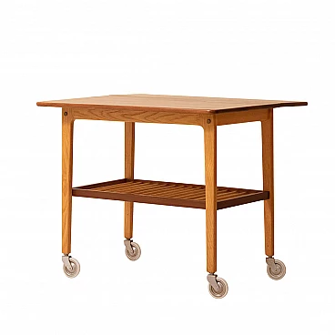 Tavolo con ruote con piano in mogano e ribaltina, di provenienza svedese. Le gambe e il ripiano portariviste sono in teak; il colore più chiaro rispetto al piano dona un aspetto più fresco e moderno all’intero mobile. Grazie alle ruote può essere utilizzato nella sua funzione più classica di carrello oppure fungere da comodo tavolino in salotto. Dimensioni Lunghezza: 73, profondità: 42 + 22, altezza: 60 cm Buone condizioni. È stato profondamente ripulito e trattato con gommalacca e pura cera d’api con carnauba. Potrebbe presentare dei piccoli segni d’utilizzo nel tempo. Per piacere presta attenzione alle fotografie.