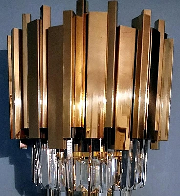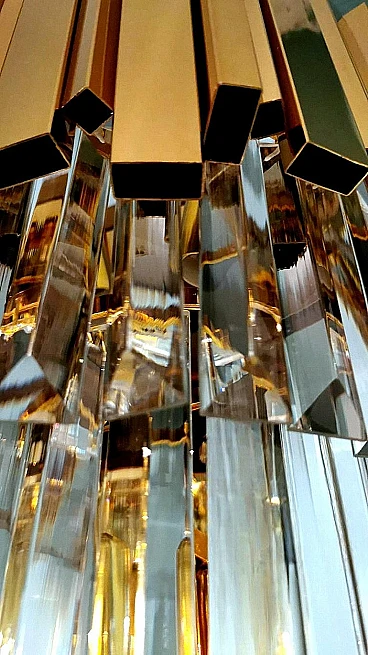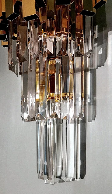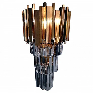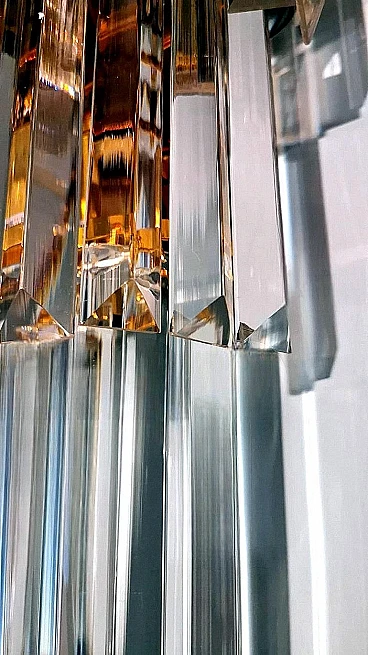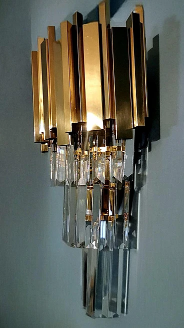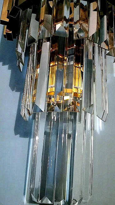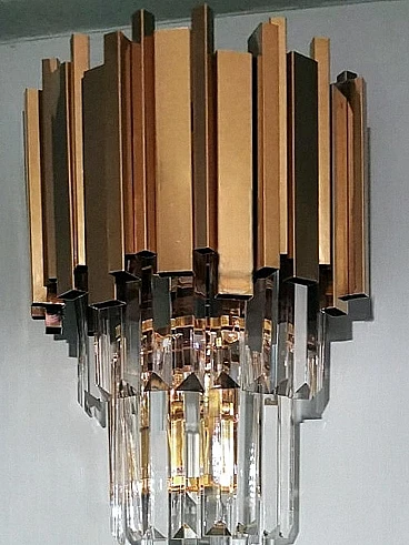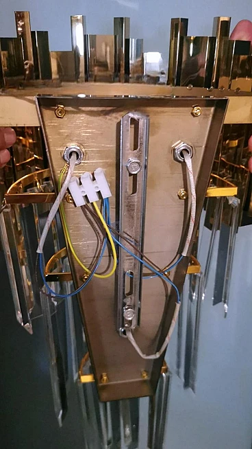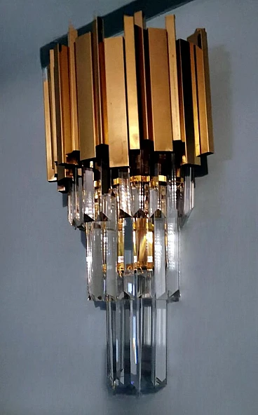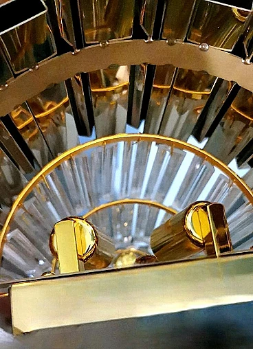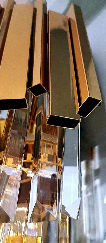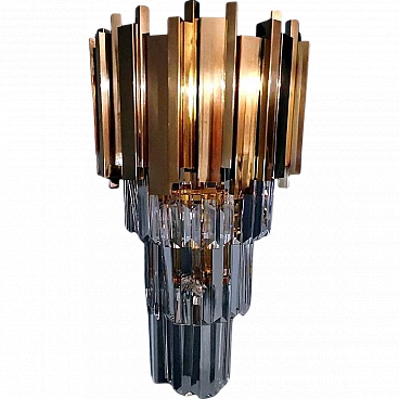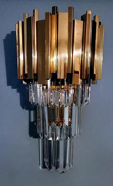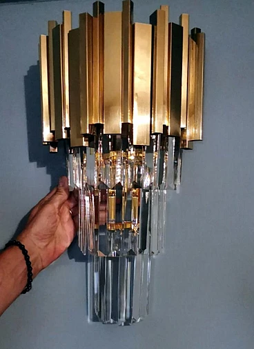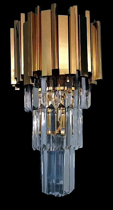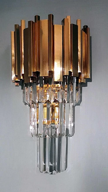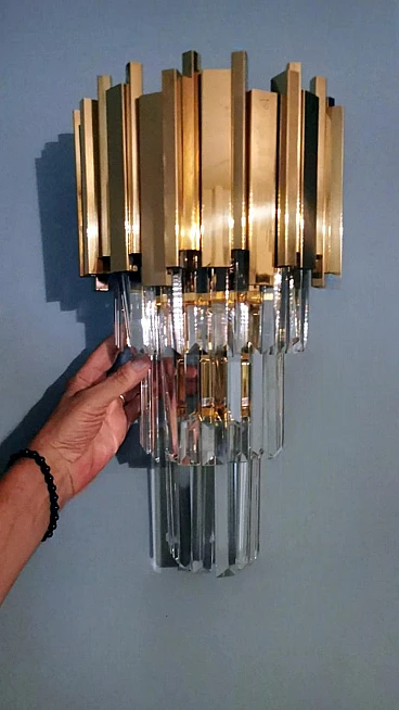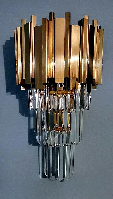 Questa applicazione in stile Venini presenta una struttura in ottone molto solida. La base è costituita da una massiccia placca triangolare (vedi foto) da cui si dipartono quattro strutture semicircolari a gradini. Sul semicerchio superiore, sono elegantemente fissate barre rettangolari di ottone spazzolato a diverse altezze. Queste barre sono scavate per ridurre il peso. Sugli altri tre semicerchi in ottone, numerosi cristalli "triedri" di Murano sono posizionati in modo esteticamente perfetto e raffinato. La particolare forma di questi cristalli permette alla luce, prodotta dalle tre lampadine nascoste, di diffondersi in modo unico e scintillante, creando una favolosa esplosione di luce e raggi. La placca triangolare serve anche per appendere l'applique alla parete e tutti i fili per il collegamento elettrico convergono sul retro. Un triedro è una figura solida convessa determinata da tre semilinee che hanno origine da un punto. Se il poligono generatore è un triangolo, si ottiene il triedro più semplice. La combinazione di ottone e cristalli tridimensionali è tipica del design di alta gamma, attribuibile a famosi designer come Venini e Sciolari, che spesso utilizzavano questi materiali. Tuttavia, molti artigiani italiani, ispirati da questi stili, hanno creato pezzi simili senza una firma o un marchio specifico ma con una lavorazione eccezionalmente attenta e raffinata. L'applique è stata prodotta da maestri artigiani in un laboratorio del Veneto (Italia), probabilmente alla periferia di Venezia, tra il 2000 e il 2005. Rappresenta uno stile Mid-Century Modern con influenze Art Deco. L'uso di ottone e cristalli tridimensionali è tipico di questi periodi, caratterizzati da una forte enfasi sulla combinazione di lusso e funzionalità. Il design moderno dell'applique è il risultato di una riflessione estetica intelligente, caratterizzata da design innovativi e creativi con linee audaci e semplici. L'applique è in buone condizioni. Misure: larghezza 30 cm, profondità 20 cm, altezza 48 cm. L'impianto elettrico è nuovo, ma il cablaggio è europeo; prima di utilizzarlo, un elettricista dovrebbe verificare la compatibilità della tensione in altri paesi.