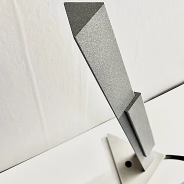 Questa lampada da scrivania Louis Poulsen Pisa è stata prodotta intorno ai primi anni 2000, caratterizzata da un design elegante e minimalista con una base triangolare in solido acciaio, uno stelo grigio girevole con dettagli in acciaio e lamelle riflettenti in alluminio. Originariamente veniva prodotto in quantità limitate, rendendolo un pezzo raro e ricercato.