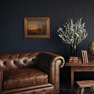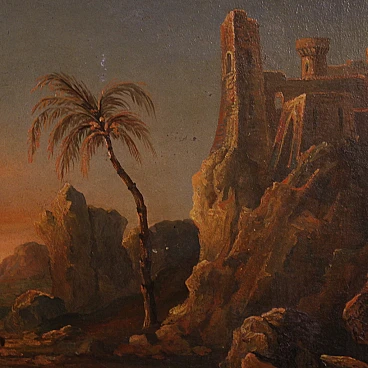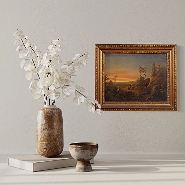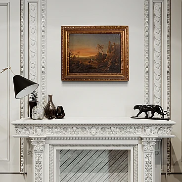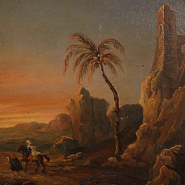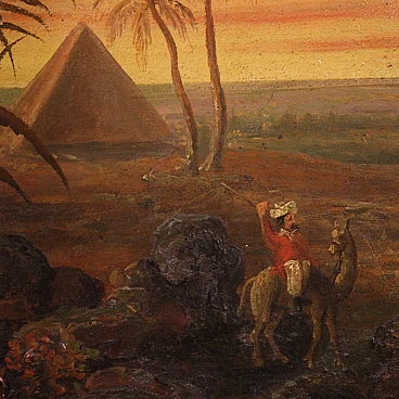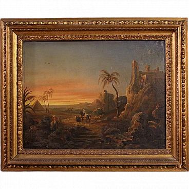Splendido dipinto orientalista della seconda metà del XIX secolo. Opera francese ad olio su tela raffigurante paesaggio nel deserto con figure, di gusto romantico. Sullo sfondo vediamo una piramide e sulla destra un castello medievale arroccato sulla montagna. Al centro della composizione un sentiero con personaggi a cavallo o con cammello. Cornice coeva in legno scolpito e dorato, di bella decorazione, con alcuni segni del tempo. Opera che presenta piccole cadute di colore (vedi foto), nel complesso in buono stato conservativo. Luce dipinto 34,4 x L 45,5 cm.
