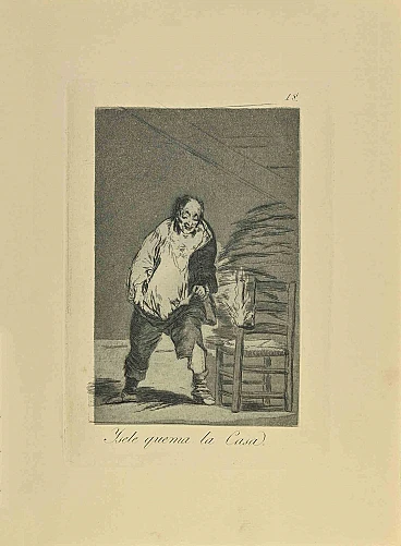 Quema La Casa è un'acquatinta in bianco e nero, puntasecca e acquaforte stampata con inchiostro blu-nero su carta vergata di Caprichos realizzata dopo Francisco Goya nel 1881-1886, sesta edizione. Titolato in bassoOttima impressione.Madrid: Calcografia Real, 1881-1886La prima edizione di Capricci fu pubblicata il 6 febbraio 1799 e messa in vendita lo stesso giorno in un negozio di liquori e profumi in Calle DesengaÏo, a Madrid. Lo stesso giorno, nel Diario de Madrid, Goya si preoccupa e cerca di ribadire che i Capricci sono un'opera nata dalla sua immaginazione e senza riferimenti reali. Tuttavia, preoccupato per la reazione del pubblico e dell'inquisizione, decise dopo sole 27 copie vendute di ritirare l'edizione dal mercato e così nel 1803 donò le restanti copie dei Capricci e le relative tavole al Re in cambio di una pensione per suo figlio. L'opera venne successivamente ristampata dalla Calcografa Nacional di Madrid in più edizioni dal 1855 al 1937 dopo la prima del 1799.