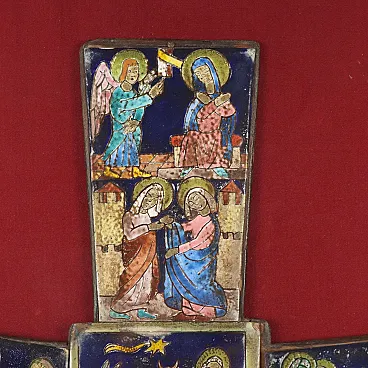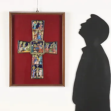 La Croce è costituita da cinque formelle, disposte a forma di croce latina, sulle quali sono rappresentati con vivaci figurazioni smaltate sette episodi della vita di Gesù.