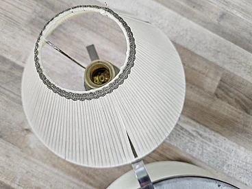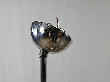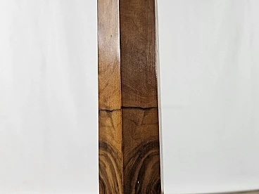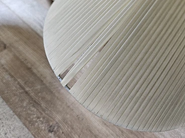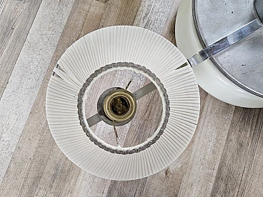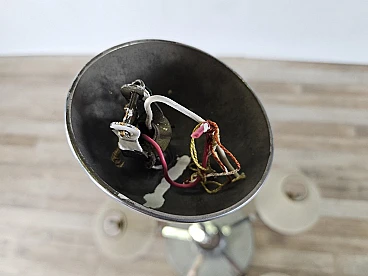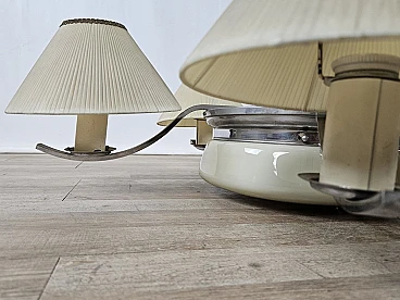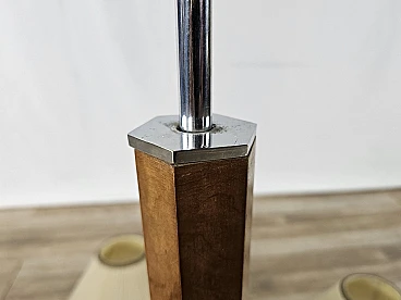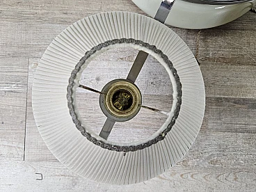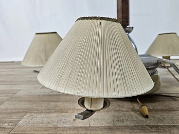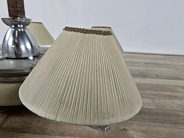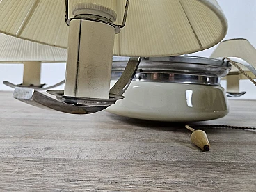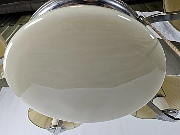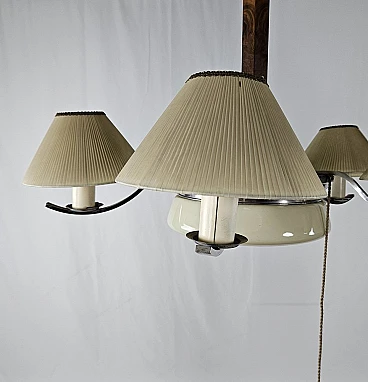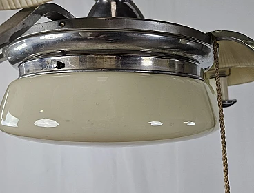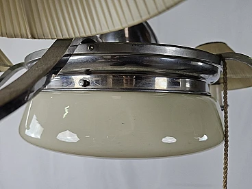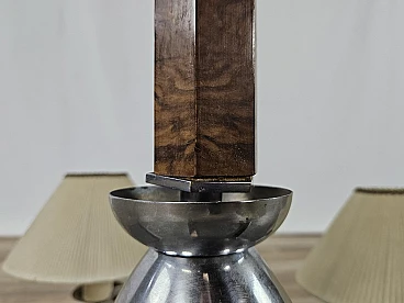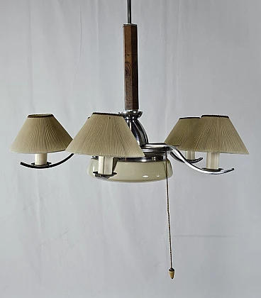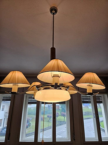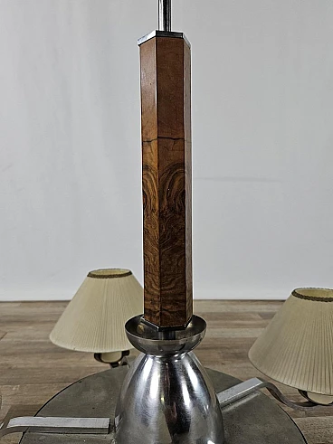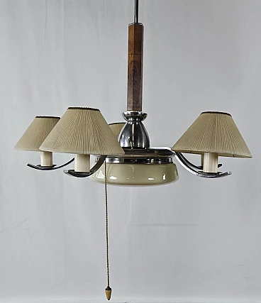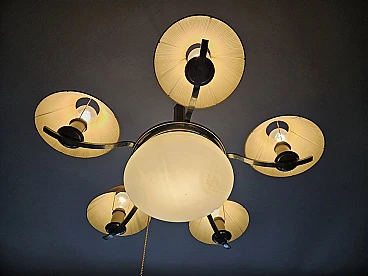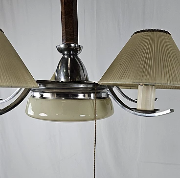 Grande lampadario italiano di epoca Art Decò con struttura in acciaio decorata da un rivestimento in radica di legno e paralumi in carta stoffa. Da notare l'armonia delle braccia in acciaio che sorreggono i punti luce e il design della lampada stessa. Va a completa il lampadario una bellissima plafoniera in vetro posta alla base. I paralumi misurano 22.5cm di diametro alla base e 7cm nella zona superiore. Lampadine non incluse. Alcuni paralumi presentano alcuni spazi vuoti come da foto, cosa normale vista l'epoca del lampadario e in ogni caso ininfluente co il suo utilizzo. Normali segni dovuti all'età e all'utilizzo. L'impianto elettrico è originale dell'epoca e funziona ma si consiglia di sostituirlo per sicurezza.