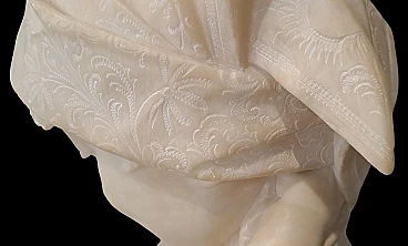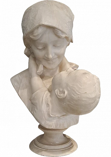 Scultura in alabastro raffigurante il busto di una mamma sorridente che guarda amorevolmente il proprio bambino che la abbraccia.
