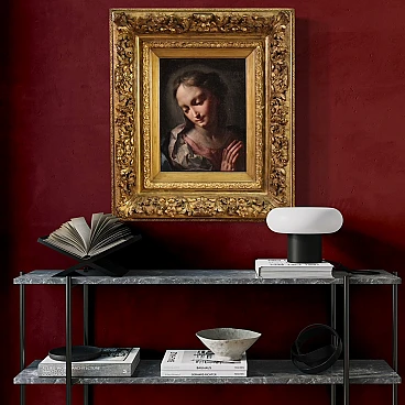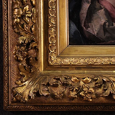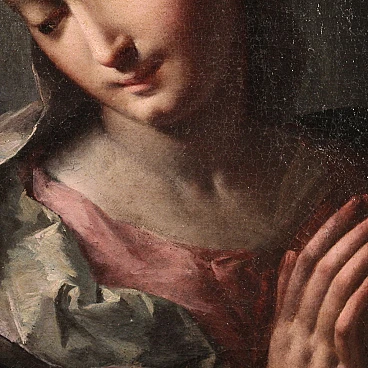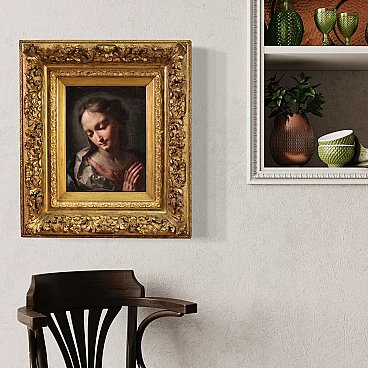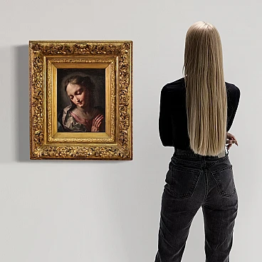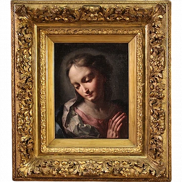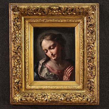 Scuola veneziana della prima metà del XVIII secolo. Opera ad olio su tela di notevole qualità pittorica raffigurante una meravigliosa Madonna. L'autore va ricercato nell'ambito di Giambattista Pittoni (1687-1767), uno dei più grandi esponente del rococò veneziano, mancante di autentica. Da evidenziare il magistrale uso della tecnica dello sfumato leonardesco, la raffinatezza della pittura tonale e l'estrema eleganza del panneggio. Scenografica cornice del XIX secolo in legno intagliato e dorato, con alcuni segni del tempo. Opera già restaurata con rintelo, sostituzione del telaio e ripresa del colore in piccoli punti. Nel complesso in ottimo stato conservativo. Luce dipinto H 35 x L 27 cm.