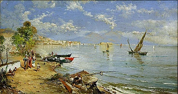 Rinomato per la sua passione e il suo amore per il paesaggio napoletano, l'opera di Allegretti è un sentito omaggio alla sua città natale, di cui cattura il fascino senza tempo e la tranquilla bellezza. Questo paesaggio malinconico, caratterizzato da una vibrante scena marina, è una delle opere più rappresentative di Allegretti. La pennellata meticolosa e la composizione armoniosa riflettono il profondo legame dell'artista con il mare e la città. L'attenzione ai dettagli nella rappresentazione delle barche, della costa e della vista lontana del Vesuvio evoca un senso di nostalgia e ammirazione per Napoli. Questo pezzo unico è una testimonianza dell'abilità e della profondità emotiva di Allegretti e rappresenta un'aggiunta preziosa a qualsiasi collezione d'arte. Il dipinto è incorniciato in una splendida cornice di legno dorata che ne esalta l'eleganza e ne preserva le condizioni.
