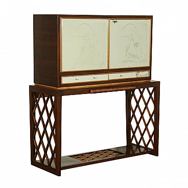 Mobile bar con illuminazione interna, ante battenti, doppio cassetto, piano estraibile, legno massello e impiallacciato mogano, vetri a specchio decorati, interni con tasselli a specchio.