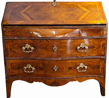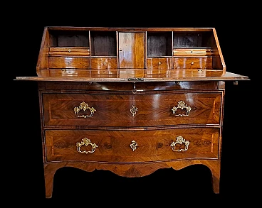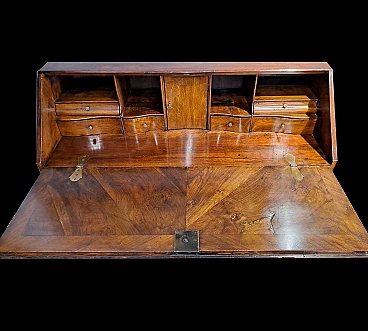 Il fronte e la calatoia sono lastronati in legno di noce disposto a lisca di pesce e i profili sono contornati da filetti in bois de rose.