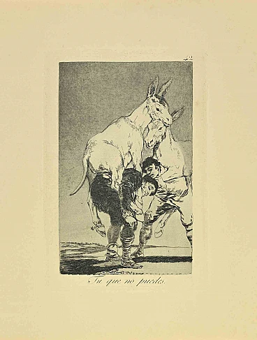 Tu Que no Puedes è un'acquatinta in bianco e nero, puntasecca e acquaforte stampata con inchiostro blu-nero su carta vergata di Caprichos realizzata dopo Francisco Goya nel 1881-1886, sesta edizione. Ottima impressione. Madrid: Calcografia Real, 1881-1886 Dimensioni del foglio: 31 x 23.La prima edizione dei Capricci fu pubblicata il 6 febbraio 1799 e messa in vendita lo stesso giorno in un negozio di liquori e profumi in Calle DesengaÏo, a Madrid. Lo stesso giorno, nel Diario de Madrid, Goya si preoccupa e cerca di ribadire che i Capricci sono un'opera nata dalla sua immaginazione e senza riferimenti reali. Tuttavia, preoccupato per la reazione del pubblico e dell'inquisizione, decise dopo che furono vendute solo 27 copie di ritirare l'edizione dal mercato e così nel 1803 donò le restanti copie dei Capricci e le relative tavole al Re in cambio di una pensione per suo figlio. L'opera venne successivamente ristampata dalla Calcografa Nacional di Madrid in più edizioni dal 1855 al 1937 dopo la prima del 1799.