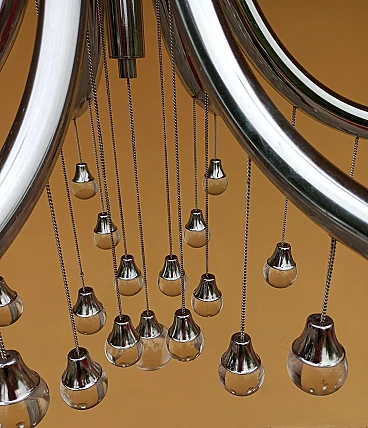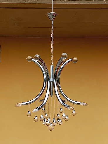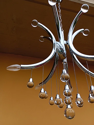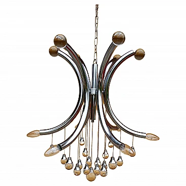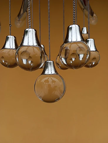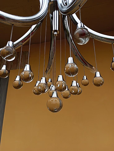 Il lampadario di Gaetano Scolari è un esempio raffinato e sofisticato di design moderno del XX secolo. La struttura centrale è caratterizzata da una base cromata lucida, con sei bracci curvi uniti al centro. Alla fine di ciascuno dei sei bracci si trovano le lampadine, posizionate in modo da illuminare uniformemente l'ambiente circostante. In alto ci sono sei bolle in vetro trasparente, una per ogni braccio. Sotto si trovano numerosi pendenti realizzati in vetro soffiato. Questi pendenti, simili a bolle di varie dimensioni, creano un effetto visivo sorprendente e affascinante. Ogni bolla di vetro è unica, con una leggera variazione nelle dimensioni, riflettendo la maestria artigianale della lavorazione del vetro soffiato. L'interazione tra il metallo cromato lucido e le delicate bolle di vetro soffiato crea un contrasto interessante e sofisticato. La trasparenza e la leggerezza del vetro bilanciano la solidità e la lucentezza del metallo, rendendo il lampadario non solo un oggetto funzionale, ma anche una scultura luminosa che arricchisce l'ambiente con la sua presenza distintiva. Le sue dimensioni sono: diametro 51 cm. h 70 Necessita di lampadine E14 (110-240V). ANGELO GAETANO SCIOLARI (1927-1994). Dopo essersi laureato alla Facoltà di Architettura, si dedica alla cinematografia ma alla morte di suo padre nel 1949, rileva l'attività di famiglia Sciolari lighitng . In pochi anni, il designer trasforma l'azienda e la proietta sulla scena internazionale. Sciolari divenne il principale rivenditore di illuminazione italiano negli Stati Uniti. Gaetano non è solo un brillante imprenditore, ma anche un designer prolifico e di talento. Ha lavorato per alcuni dei più grandi nomi del design, tra cui Stilnovo, Boulanger e Stilkronen.