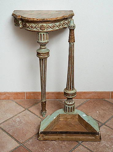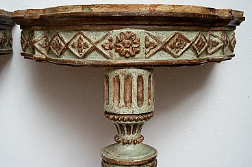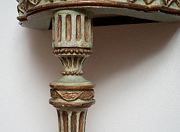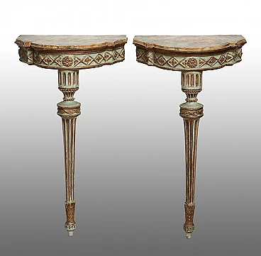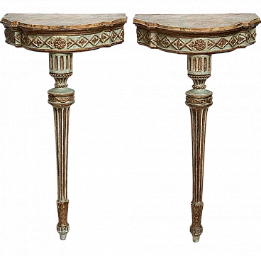Descrizione: Coppia di consolline demi lune stile Luigi XVI Piemontese in lacca verde e oro appartenente agli inizi del XX secolo.