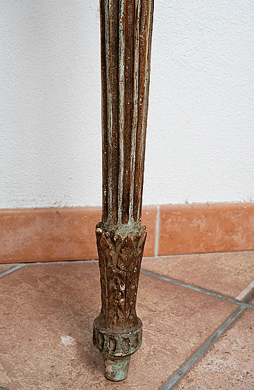 Il piano con effetto marmorizzato è retto da una fascia sottopiano finemente scolpita a motivi geometrici alternati a racemi e fiori.
