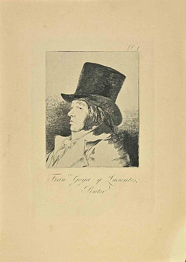 Francisco Josè de Goya y Lucientes è un'acquatinta in bianco e nero, puntasecca e acquaforte stampata con inchiostro blu-nero su carta vergata di Caprichos realizzata dopo Francisco Goya nel 1881-1886. 6a edizione. Ottima impressione.Madrid: Calcografia Real, 1881- 1886Misura del foglio: 31 x 23.La prima edizione dei Capricci fu pubblicata il 6 febbraio 1799 e messa in vendita lo stesso giorno in un negozio di liquori e profumi in Calle DesengaÏo, a Madrid. Lo stesso giorno, nel Diario de Madrid, Goya si preoccupa e cerca di ribadire che i Capricci sono un'opera nata dalla sua immaginazione e senza riferimenti reali. Tuttavia, preoccupato per la reazione del pubblico e dell'inquisizione, decise dopo sole 27 copie vendute di ritirare l'edizione dal mercato e così nel 1803 donò le restanti copie dei Capricci e le relative tavole al Re in cambio di una pensione per suo figlio. L'opera venne successivamente ristampata dalla Calcografa Nacional di Madrid in più edizioni dal 1855 al 1937 dopo la prima del 1799.