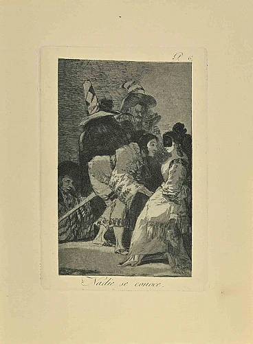 Nadie se Conoce è un'acquatinta in bianco e nero, puntasecca e acquaforte stampata con inchiostro blu-nero su carta vergata di Caprichos realizzata dopo Francisco Goya nel 1881-1886. 6a edizione. Ottima impressione.Madrid: Calcografia Real, 1881-1886 Dimensioni del foglio: 31 x 23.La prima edizione dei Capricci fu pubblicata il 6 febbraio 1799 e messa in vendita lo stesso giorno in un negozio di liquori e profumi in Calle DesengaÏo, a Madrid. Lo stesso giorno, nel Diario de Madrid, Goya si preoccupa e cerca di ribadire che i Capricci sono un'opera nata dalla sua immaginazione e senza riferimenti reali. Tuttavia, preoccupato per la reazione del pubblico e dell'inquisizione, decise dopo sole 27 copie vendute di ritirare l'edizione dal mercato e così nel 1803 donò le restanti copie dei Capricci e le relative tavole al Re in cambio di una pensione per suo figlio. L'opera venne successivamente ristampata dalla Calcografa Nacional di Madrid in più edizioni dal 1855 al 1937 dopo la prima del 1799.