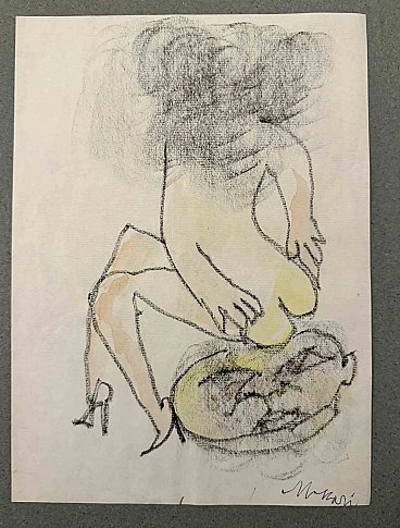 Seduto è un disegno a carboncino realizzato da Mino Maccari (1924-1989) nella metà del XX secolo. Firmato a mano. Buone condizioni con lievi fioriture. Mino Maccari (Siena, 1924-Roma, 16 giugno 1989) è stato uno scrittore italiano, pittore, incisore e giornalista, vincitore del Premio Feltrinelli per la Pittura nel 1963 e primo vincitore del Premio Satira Forte dei Marmi nel 1973. Terminati gli studi secondari, si iscrive all'università. Interventista come molti giovani del suo tempo, prese parte alla Grande Guerra all'età di diciannove anni come ufficiale di artiglieria da campo. Al termine del conflitto riprese gli studi universitari a Siena e nel 1920 si laureò in giurisprudenza. Nel 1924 fu chiamato da Angiolo Bencini a curare la stampa della rivista Il Selvaggio, apertamente intransigente fascista, rivoluzionaria e antiborghese, dove furono pubblicate le sue prime incisioni. Dopo alcuni anni di convivenza tra il lavoro al giornale e lo studio legale, all'inizio del 1926 lasciò la professione forense per assumere la direzione de Il Selvaggio che manterrà fino al 1942. Nel 1928 fu autore del piccolo libro edito da Vallecchi (Firenze), Il Trastullo di Strapaese (canzoni e legni incisi) che raccoglieva canti fascisti (lo stesso libro fu più volte sequestrato ad Antonio Gramsci durante la sua detenzione). Con il trasferimento della redazione del Selvaggio nel 1925 da Colle di Val d'Elsa a Firenze, Maccari collaborò con Ardengo Soffici, Ottone Rosai e Achille Lega. Nel frattempo, tra il 1927 e il 1930, si fa conoscere al grande pubblico come pittore partecipando a diverse mostre nazionali. Sempre nel 1930 Maccari lavora a Torino presso La Stampa come caporedattore e ha come direttore lo scrittore Curzio Malaparte. Molto intensa la sua presenza nel mondo culturale ed editoriale del regime fascista, scrive e collabora con diverse riviste: Quadrivio, L'Italia Letteraria, L'Italiano e Omnibus di Leo Longanesi; poi, durante la guerra, ne Il Primato di Bottai e, successivamente ancora, ne Il Mondo di Pannunzio (dal primo numero, nel 1949), fino a Documento di Federigo Valli. Vasta è anche la sua produzione grafica, che spazia dall'Album di Vallecchi (1925), Il trastullo di Strapaese (1928) a Linoleum (1931). Maccari illustrò nel 1934 La vecchia del Bal Bullier di Antonio Baldini e nel 1942 pubblicò la cartella Album, seguita da Come quando fuori Piove e Il superfluo illustrata. Per la sua opera pittorica ricca di evidenti accentuazioni cromatiche e di pennellate veloci, il disegno violento unito alla per il tratto vivace del segno grafico delle sue incisioni, è riconosciuto dalla critica come un artista completo. Nel 1962 gli viene affidata anche la presidenza dell'Accademia di San Luca a Roma e riesce ad ottenere una mostra personale alla Galleria 63 di New York. Infinita è la sua produzione di disegni, acquerelli, tempere, ecc., talvolta in collaborazione con prestigiose case editrici; da citare, a titolo esemplificativo, i 32 disegni in bianco e nero e a colori con cui ha illustrato Il gusto di vivere, volume che raccoglie scritti di Giancarlo Fusco, a cura di Natalia Aspesi e pubblicato da Laterza nel 1985. Maccari, Senese e grande contradaiolo della Torre, dipinse il Palio del 16 agosto 1970 vinto da Selva. Nel 1973 gli viene assegnato il Premio Satira Politica di Forte dei Marmi, premio nato in quell'anno. Morì senza grandi clamori, in silenzio, all'età di novant'anni, a Roma il 16 giugno 1989.