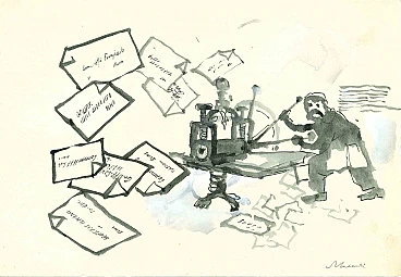 La stampa è un disegno ad acquerello realizzato da Mino Maccari (1924-1989) nella metà del XX secolo. Firmato a mano. Buone condizioni con lievi fioriture. Mino Maccari (Siena, 1924-Roma, 16 giugno 1989) è stato uno scrittore italiano, pittore, incisore e giornalista, vincitore del Premio Feltrinelli per la Pittura nel 1963 e primo vincitore del Premio Satira Forte dei Marmi nel 1973. Terminati gli studi secondari, si iscrive all'università. Interventista come molti giovani del suo tempo, prese parte alla Grande Guerra all'età di diciannove anni come ufficiale di artiglieria da campo. Al termine del conflitto riprese gli studi universitari a Siena e nel 1920 si laureò in giurisprudenza. Nel 1924 fu chiamato da Angiolo Bencini a curare la stampa della rivista Il Selvaggio, apertamente intransigente fascista, rivoluzionaria e antiborghese, dove furono pubblicate le sue prime incisioni. Dopo alcuni anni di convivenza tra il lavoro al giornale e lo studio legale, all'inizio del 1926 lasciò la professione forense per assumere la direzione de Il Selvaggio che manterrà fino al 1942. Nel 1928 fu autore del piccolo libro edito da Vallecchi (Firenze), Il Trastullo di Strapaese (canzoni e legni incisi) che raccoglieva canti fascisti (lo stesso libro fu più volte sequestrato ad Antonio Gramsci durante la sua detenzione). Con il trasferimento della redazione del Selvaggio nel 1925 da Colle di Val d'Elsa a Firenze, Maccari collaborò con Ardengo Soffici, Ottone Rosai e Achille Lega. Nel frattempo, tra il 1927 e il 1930, si fa conoscere al grande pubblico come pittore partecipando a diverse mostre nazionali. Sempre nel 1930 Maccari lavora a Torino presso La Stampa come caporedattore e ha come direttore lo scrittore Curzio Malaparte. Molto intensa la sua presenza nel mondo culturale ed editoriale del regime fascista, scrive e collabora con diverse riviste: Quadrivio, L'Italia Letteraria, L'Italiano e Omnibus di Leo Longanesi; poi, durante la guerra, ne Il Primato di Bottai e, successivamente ancora, ne Il Mondo di Pannunzio (dal primo numero, nel 1949), fino a Documento di Federigo Valli. Vasta è anche la sua produzione grafica, che spazia dall'Album di Vallecchi (1925), Il trastullo di Strapaese (1928) a Linoleum (1931). Maccari illustrò nel 1934 La vecchia del Bal Bullier di Antonio Baldini e nel 1942 pubblicò la cartella Album, seguita da Come quando fuori Piove e Il superfluo illustrata. Per la sua opera pittorica ricca di evidenti accentuazioni cromatiche e di pennellate veloci, il disegno violento unito alla per il tratto vivace del segno grafico delle sue incisioni, è riconosciuto dalla critica come un artista completo. Nel 1962 gli viene affidata anche la presidenza dell'Accademia di San Luca a Roma e riesce ad ottenere una mostra personale alla Galleria 63 di New York. Infinita è la sua produzione di disegni, acquerelli, tempere, ecc., talvolta in collaborazione con prestigiose case editrici; da citare, a titolo esemplificativo, i 32 disegni in bianco e nero e a colori con cui ha illustrato Il gusto di vivere, volume che raccoglie scritti di Giancarlo Fusco, a cura di Natalia Aspesi e pubblicato da Laterza nel 1985. Maccari, Senese e grande contradaiolo della Torre, dipinse il Palio del 16 agosto 1970 vinto da Selva. Nel 1973 gli viene assegnato il Premio Satira Politica di Forte dei Marmi, premio nato in quell'anno. Morì senza grandi clamori, in silenzio, all'età di novant'anni, a Roma il 16 giugno 1989.