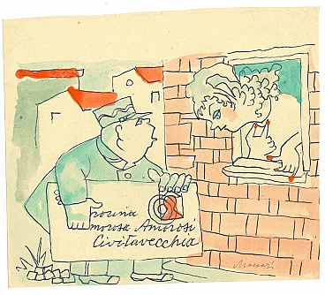 Civitavecchia è un disegno a penna e acquerello realizzato da Mino Maccari (1924-1989) nella metà del XX secolo. Firmato a mano. Buone condizioni con lievi fioriture. Mino Maccari (Siena, 1924-Roma, 16 giugno 1989) è stato uno scrittore italiano , pittore, incisore e giornalista, vincitore del Premio Feltrinelli per la Pittura nel 1963 e primo vincitore del Premio Satira Forte dei Marmi nel 1973. Terminati gli studi secondari, si iscrive all'università. Interventista come molti giovani del suo tempo, prese parte alla Grande Guerra all'età di diciannove anni come ufficiale di artiglieria da campo. Al termine del conflitto riprese gli studi universitari a Siena e nel 1920 si laureò in giurisprudenza. Nel 1924 fu chiamato da Angiolo Bencini a curare la stampa della rivista Il Selvaggio, apertamente intransigente fascista, rivoluzionaria e antiborghese, dove furono pubblicate le sue prime incisioni. Dopo alcuni anni di convivenza tra il lavoro al giornale e lo studio legale, all'inizio del 1926 lasciò la professione forense per assumere la direzione de Il Selvaggio che manterrà fino al 1942. Nel 1928 fu autore del piccolo libro edito da Vallecchi (Firenze), Il Trastullo di Strapaese (canzoni e legni incisi) che raccoglieva canti fascisti (lo stesso libro fu più volte sequestrato ad Antonio Gramsci durante la sua detenzione). Con il trasferimento della redazione del Selvaggio nel 1925 da Colle di Val d'Elsa a Firenze, Maccari collaborò con Ardengo Soffici, Ottone Rosai e Achille Lega. Nel frattempo, tra il 1927 e il 1930, si fa conoscere al grande pubblico come pittore partecipando a diverse mostre nazionali. Sempre nel 1930 Maccari lavora a Torino presso La Stampa come caporedattore e ha come direttore lo scrittore Curzio Malaparte. Molto intensa la sua presenza nel mondo culturale ed editoriale del regime fascista, scrive e collabora con diverse riviste: Quadrivio, L'Italia Letteraria, L'Italiano e Omnibus di Leo Longanesi; poi, durante la guerra, ne Il Primato di Bottai e, successivamente ancora, ne Il Mondo di Pannunzio (dal primo numero, nel 1949), fino a Documento di Federigo Valli. Vasta è anche la sua produzione grafica, che spazia dall'Album di Vallecchi (1925), Il trastullo di Strapaese (1928) a Linoleum (1931). Maccari illustrò nel 1934 La vecchia del Bal Bullier di Antonio Baldini e nel 1942 pubblicò la cartella Album, seguita da Come quando fuori Piove e Il superfluo illustrata. Per la sua opera pittorica ricca di evidenti accentuazioni cromatiche e di pennellate veloci, il disegno violento unito alla per il tratto vivace del segno grafico delle sue incisioni, è riconosciuto dalla critica come un artista completo. Nel 1962 gli viene affidata anche la presidenza dell'Accademia di San Luca a Roma e riesce ad ottenere una mostra personale alla Galleria 63 di New York. Infinita è la sua produzione di disegni, acquerelli, tempere, ecc., talvolta in collaborazione con prestigiose case editrici; da citare, a titolo esemplificativo, i 32 disegni in bianco e nero e a colori con cui ha illustrato Il gusto di vivere, volume che raccoglie scritti di Giancarlo Fusco, a cura di Natalia Aspesi e pubblicato da Laterza nel 1985. Maccari, Senese e grande contradaiolo della Torre, dipinse il Palio del 16 agosto 1970 vinto da Selva. Nel 1973 gli viene assegnato il Premio Satira Politica di Forte dei Marmi, premio nato in quell'anno. Morì senza grandi clamori, in silenzio, all'età di novant'anni, a Roma il 16 giugno 1989.