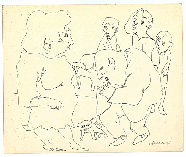 Figures è un disegno a inchiostro di china realizzato da Mino Maccari (1924-1989) nella metà del XX secolo. Firmato a mano. Buone condizioni con lievi fioriture. Mino Maccari (Siena, 1924-Roma, 16 giugno 1989) è stato uno scrittore italiano , pittore, incisore e giornalista, vincitore del Premio Feltrinelli per la Pittura nel 1963 e primo vincitore del Premio Satira Forte dei Marmi nel 1973. Terminati gli studi secondari, si iscrive all'università. Interventista come molti giovani del suo tempo, prese parte alla Grande Guerra all'età di diciannove anni come ufficiale di artiglieria da campo. Al termine del conflitto riprese gli studi universitari a Siena e nel 1920 si laureò in giurisprudenza. Nel 1924 fu chiamato da Angiolo Bencini a curare la stampa della rivista Il Selvaggio, apertamente intransigente fascista, rivoluzionaria e antiborghese, dove furono pubblicate le sue prime incisioni. Dopo alcuni anni di convivenza tra il lavoro al giornale e lo studio legale, all'inizio del 1926 lasciò la professione forense per assumere la direzione de Il Selvaggio che manterrà fino al 1942. Nel 1928 fu autore del piccolo libro edito da Vallecchi (Firenze), Il Trastullo di Strapaese (canzoni e legni incisi) che raccoglieva canti fascisti (lo stesso libro fu più volte sequestrato ad Antonio Gramsci durante la sua detenzione). Con il trasferimento della redazione del Selvaggio nel 1925 da Colle di Val d'Elsa a Firenze, Maccari collaborò con Ardengo Soffici, Ottone Rosai e Achille Lega. Nel frattempo, tra il 1927 e il 1930, si fa conoscere al grande pubblico come pittore partecipando a diverse mostre nazionali. Sempre nel 1930 Maccari lavora a Torino presso La Stampa come caporedattore e ha come direttore lo scrittore Curzio Malaparte. Molto intensa la sua presenza nel mondo culturale ed editoriale del regime fascista, scrive e collabora con diverse riviste: Quadrivio, L'Italia Letteraria, L'Italiano e Omnibus di Leo Longanesi; poi, durante la guerra, ne Il Primato di Bottai e, successivamente ancora, ne Il Mondo di Pannunzio (dal primo numero, nel 1949), fino a Documento di Federigo Valli. Vasta è anche la sua produzione grafica, che spazia dall'Album di Vallecchi (1925), Il trastullo di Strapaese (1928) a Linoleum (1931). Maccari illustrò nel 1934 La vecchia del Bal Bullier di Antonio Baldini e nel 1942 pubblicò la cartella Album, seguita da Come quando fuori Piove e Il superfluo illustrata. Per la sua opera pittorica ricca di evidenti accentuazioni cromatiche e di pennellate veloci, il disegno violento unito alla per il tratto vivace del segno grafico delle sue incisioni, è riconosciuto dalla critica come un artista completo. Nel 1962 gli viene affidata anche la presidenza dell'Accademia di San Luca a Roma e riesce ad ottenere una mostra personale alla Galleria 63 di New York. Infinita è la sua produzione di disegni, acquerelli, tempere, ecc., talvolta in collaborazione con prestigiose case editrici; da citare, a titolo esemplificativo, i 32 disegni in bianco e nero e a colori con cui ha illustrato Il gusto di vivere, volume che raccoglie scritti di Giancarlo Fusco, a cura di Natalia Aspesi e pubblicato da Laterza nel 1985. Maccari, Senese e grande contradaiolo della Torre, dipinse il Palio del 16 agosto 1970 vinto da Selva. Nel 1973 gli viene assegnato il Premio Satira Politica di Forte dei Marmi, premio nato in quell'anno. Morì senza grandi clamori, in silenzio, all'età di novant'anni, a Roma il 16 giugno 1989.