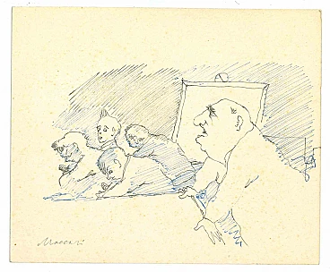 Classroom è un'opera d'arte a penna realizzata da Mino Maccari (1924-1989) nella metà del XX secolo. Firmato a mano. Buone condizioni con lievi fioriture. Mino Maccari (Siena, 1924-Roma, 16 giugno 1989) è stato uno scrittore italiano , pittore, incisore e giornalista, vincitore del Premio Feltrinelli per la Pittura nel 1963 e primo vincitore del Premio Satira Forte dei Marmi nel 1973. Terminati gli studi secondari, si iscrive all'università. Interventista come molti giovani del suo tempo, prese parte alla Grande Guerra all'età di diciannove anni come ufficiale di artiglieria da campo. Al termine del conflitto riprese gli studi universitari a Siena e nel 1920 si laureò in giurisprudenza. Nel 1924 fu chiamato da Angiolo Bencini a curare la stampa della rivista Il Selvaggio, apertamente intransigente fascista, rivoluzionaria e antiborghese, dove furono pubblicate le sue prime incisioni. Dopo alcuni anni di convivenza tra il lavoro al giornale e lo studio legale, all'inizio del 1926 lasciò la professione forense per assumere la direzione de Il Selvaggio che manterrà fino al 1942. Nel 1928 fu autore del piccolo libro edito da Vallecchi (Firenze), Il Trastullo di Strapaese (canzoni e legni incisi) che raccoglieva canti fascisti (lo stesso libro fu più volte sequestrato ad Antonio Gramsci durante la sua detenzione). Con il trasferimento della redazione del Selvaggio nel 1925 da Colle di Val d'Elsa a Firenze, Maccari collaborò con Ardengo Soffici, Ottone Rosai e Achille Lega. Nel frattempo, tra il 1927 e il 1930, si fa conoscere al grande pubblico come pittore partecipando a diverse mostre nazionali. Sempre nel 1930 Maccari lavora a Torino presso La Stampa come caporedattore e ha come direttore lo scrittore Curzio Malaparte. Molto intensa la sua presenza nel mondo culturale ed editoriale del regime fascista, scrive e collabora con diverse riviste: Quadrivio, L'Italia Letteraria, L'Italiano e Omnibus di Leo Longanesi; poi, durante la guerra, ne Il Primato di Bottai e, successivamente ancora, ne Il Mondo di Pannunzio (dal primo numero, nel 1949), fino a Documento di Federigo Valli. Vasta è anche la sua produzione grafica, che spazia dall'Album di Vallecchi (1925), Il trastullo di Strapaese (1928) a Linoleum (1931). Maccari illustrò nel 1934 La vecchia del Bal Bullier di Antonio Baldini e nel 1942 pubblicò la cartella Album, seguita da Come quando fuori Piove e Il superfluo illustrata. Per la sua opera pittorica ricca di evidenti accentuazioni cromatiche e di pennellate veloci, il disegno violento unito alla per il tratto vivace del segno grafico delle sue incisioni, è riconosciuto dalla critica come un artista completo. Nel 1962 gli viene affidata anche la presidenza dell'Accademia di San Luca a Roma e riesce ad ottenere una mostra personale alla Galleria 63 di New York. Infinita è la sua produzione di disegni, acquerelli, tempere, ecc., talvolta in collaborazione con prestigiose case editrici; da citare, a titolo esemplificativo, i 32 disegni in bianco e nero e a colori con cui ha illustrato Il gusto di vivere, volume che raccoglie scritti di Giancarlo Fusco, a cura di Natalia Aspesi e pubblicato da Laterza nel 1985. Maccari, Senese e grande contradaiolo della Torre, dipinse il Palio del 16 agosto 1970 vinto da Selva. Nel 1973 gli viene assegnato il Premio Satira Politica di Forte dei Marmi, premio nato in quell'anno. Morì senza grandi clamori, in silenzio, all'età di novant'anni, a Roma il 16 giugno 1989.