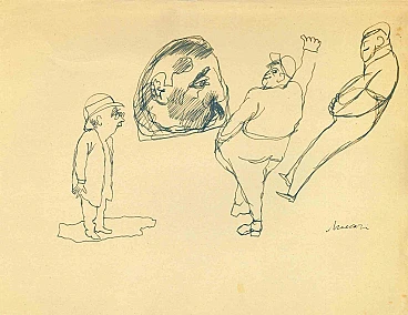 Figures è un disegno a inchiostro di china realizzato da Mino Maccari (1924-1989) nella metà del XX secolo. Firmato a mano. Buone condizioni con lievi fioriture. Mino Maccari (Siena, 1924-Roma, 16 giugno 1989) è stato uno scrittore italiano , pittore, incisore e giornalista, vincitore del Premio Feltrinelli per la Pittura nel 1963 e primo vincitore del Premio Satira Forte dei Marmi nel 1973. Terminati gli studi secondari, si iscrive all'università. Interventista come molti giovani del suo tempo, prese parte alla Grande Guerra all'età di diciannove anni come ufficiale di artiglieria da campo. Al termine del conflitto riprese gli studi universitari a Siena e nel 1920 si laureò in giurisprudenza. Nel 1924 fu chiamato da Angiolo Bencini a curare la stampa della rivista Il Selvaggio, apertamente intransigente fascista, rivoluzionaria e antiborghese, dove furono pubblicate le sue prime incisioni. Dopo alcuni anni di convivenza tra il lavoro al giornale e lo studio legale, all'inizio del 1926 lasciò la professione forense per assumere la direzione de Il Selvaggio che manterrà fino al 1942. Nel 1928 fu autore del piccolo libro edito da Vallecchi (Firenze), Il Trastullo di Strapaese (canzoni e legni incisi) che raccoglieva canti fascisti (lo stesso libro fu più volte sequestrato ad Antonio Gramsci durante la sua detenzione). Con il trasferimento della redazione del Selvaggio nel 1925 da Colle di Val d'Elsa a Firenze, Maccari collaborò con Ardengo Soffici, Ottone Rosai e Achille Lega. Nel frattempo, tra il 1927 e il 1930, si fa conoscere al grande pubblico come pittore partecipando a diverse mostre nazionali. Sempre nel 1930 Maccari lavora a Torino presso La Stampa come caporedattore e ha come direttore lo scrittore Curzio Malaparte. Molto intensa la sua presenza nel mondo culturale ed editoriale del regime fascista, scrive e collabora con diverse riviste: Quadrivio, L'Italia Letteraria, L'Italiano e Omnibus di Leo Longanesi; poi, durante la guerra, ne Il Primato di Bottai e, successivamente ancora, ne Il Mondo di Pannunzio (dal primo numero, nel 1949), fino a Documento di Federigo Valli. Vasta è anche la sua produzione grafica, che spazia dall'Album di Vallecchi (1925), Il trastullo di Strapaese (1928) a Linoleum (1931). Maccari illustrò nel 1934 La vecchia del Bal Bullier di Antonio Baldini e nel 1942 pubblicò la cartella Album, seguita da Come quando fuori Piove e Il superfluo illustrata. Per la sua opera pittorica ricca di evidenti accentuazioni cromatiche e di pennellate veloci, il disegno violento unito alla per il tratto vivace del segno grafico delle sue incisioni, è riconosciuto dalla critica come un artista completo. Nel 1962 gli viene affidata anche la presidenza dell'Accademia di San Luca a Roma e riesce ad ottenere una mostra personale alla Galleria 63 di New York. Infinita è la sua produzione di disegni, acquerelli, tempere, ecc., talvolta in collaborazione con prestigiose case editrici; da citare, a titolo esemplificativo, i 32 disegni in bianco e nero e a colori con cui ha illustrato Il gusto di vivere, volume che raccoglie scritti di Giancarlo Fusco, a cura di Natalia Aspesi e pubblicato da Laterza nel 1985. Maccari, Senese e grande contradaiolo della Torre, dipinse il Palio del 16 agosto 1970 vinto da Selva. Nel 1973 gli viene assegnato il Premio Satira Politica di Forte dei Marmi, premio nato in quell'anno. Morì senza grandi clamori, in silenzio, all'età di novant'anni, a Roma il 16 giugno 1989.