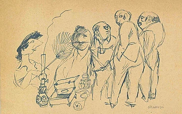 Gathering è un disegno a inchiostro di china realizzato da Mino Maccari (1924-1989) nella metà del XX secolo. Firmato a mano. Buone condizioni con lievi fioriture. Mino Maccari (Siena, 1924-Roma, 16 giugno 1989) è stato uno scrittore italiano , pittore, incisore e giornalista, vincitore del Premio Feltrinelli per la Pittura nel 1963 e primo vincitore del Premio Satira Forte dei Marmi nel 1973. Terminati gli studi secondari, si iscrive all'università. Interventista come molti giovani del suo tempo, prese parte alla Grande Guerra all'età di diciannove anni come ufficiale di artiglieria da campo. Al termine del conflitto riprese gli studi universitari a Siena e nel 1920 si laureò in giurisprudenza. Nel 1924 fu chiamato da Angiolo Bencini a curare la stampa della rivista Il Selvaggio, apertamente intransigente fascista, rivoluzionaria e antiborghese, dove furono pubblicate le sue prime incisioni. Dopo alcuni anni di convivenza tra il lavoro al giornale e lo studio legale, all'inizio del 1926 lasciò la professione forense per assumere la direzione de Il Selvaggio che manterrà fino al 1942. Nel 1928 fu autore del piccolo libro edito da Vallecchi (Firenze), Il Trastullo di Strapaese (canzoni e legni incisi) che raccoglieva canti fascisti (lo stesso libro fu più volte sequestrato ad Antonio Gramsci durante la sua detenzione). Con il trasferimento della redazione del Selvaggio nel 1925 da Colle di Val d'Elsa a Firenze, Maccari collaborò con Ardengo Soffici, Ottone Rosai e Achille Lega. Nel frattempo, tra il 1927 e il 1930, si fa conoscere al grande pubblico come pittore partecipando a diverse mostre nazionali. Sempre nel 1930 Maccari lavora a Torino presso La Stampa come caporedattore e ha come direttore lo scrittore Curzio Malaparte. Molto intensa la sua presenza nel mondo culturale ed editoriale del regime fascista, scrive e collabora con diverse riviste: Quadrivio, L'Italia Letteraria, L'Italiano e Omnibus di Leo Longanesi; poi, durante la guerra, ne Il Primato di Bottai e, successivamente ancora, ne Il Mondo di Pannunzio (dal primo numero, nel 1949), fino a Documento di Federigo Valli. Vasta è anche la sua produzione grafica, che spazia dall'Album di Vallecchi (1925), Il trastullo di Strapaese (1928) a Linoleum (1931). Maccari illustrò nel 1934 La vecchia del Bal Bullier di Antonio Baldini e nel 1942 pubblicò la cartella Album, seguita da Come quando fuori Piove e Il superfluo illustrata. Per la sua opera pittorica ricca di evidenti accentuazioni cromatiche e di pennellate veloci, il disegno violento unito alla per il tratto vivace del segno grafico delle sue incisioni, è riconosciuto dalla critica come un artista completo. Nel 1962 gli viene affidata anche la presidenza dell'Accademia di San Luca a Roma e riesce ad ottenere una mostra personale alla Galleria 63 di New York. Infinita è la sua produzione di disegni, acquerelli, tempere, ecc., talvolta in collaborazione con prestigiose case editrici; da citare, a titolo esemplificativo, i 32 disegni in bianco e nero e a colori con cui ha illustrato Il gusto di vivere, volume che raccoglie scritti di Giancarlo Fusco, a cura di Natalia Aspesi e pubblicato da Laterza nel 1985. Maccari, Senese e grande contradaiolo della Torre, dipinse il Palio del 16 agosto 1970 vinto da Selva. Nel 1973 gli viene assegnato il Premio Satira Politica di Forte dei Marmi, premio nato in quell'anno. Morì senza grandi clamori, in silenzio, all'età di novant'anni, a Roma il 16 giugno 1989.
