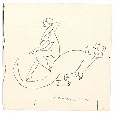 Creature è un disegno a inchiostro di china realizzato da Mino Maccari (1924-1989) nella metà del XX secolo. Firmato a mano. Buone condizioni con lievi fioriture. Mino Maccari (Siena, 1924-Roma, 16 giugno 1989) è stato uno scrittore italiano , pittore, incisore e giornalista, vincitore del Premio Feltrinelli per la Pittura nel 1963 e primo vincitore del Premio Satira Forte dei Marmi nel 1973. Terminati gli studi secondari, si iscrive all'università. Interventista come molti giovani del suo tempo, prese parte alla Grande Guerra all'età di diciannove anni come ufficiale di artiglieria da campo. Al termine del conflitto riprese gli studi universitari a Siena e nel 1920 si laureò in giurisprudenza. Nel 1924 fu chiamato da Angiolo Bencini a curare la stampa della rivista Il Selvaggio, apertamente intransigente fascista, rivoluzionaria e antiborghese, dove furono pubblicate le sue prime incisioni. Dopo alcuni anni di convivenza tra il lavoro al giornale e lo studio legale, all'inizio del 1926 lasciò la professione forense per assumere la direzione de Il Selvaggio che manterrà fino al 1942. Nel 1928 fu autore del piccolo libro edito da Vallecchi (Firenze), Il Trastullo di Strapaese (canzoni e legni incisi) che raccoglieva canti fascisti (lo stesso libro fu più volte sequestrato ad Antonio Gramsci durante la sua detenzione). Con il trasferimento della redazione del Selvaggio nel 1925 da Colle di Val d'Elsa a Firenze, Maccari collaborò con Ardengo Soffici, Ottone Rosai e Achille Lega. Nel frattempo, tra il 1927 e il 1930, si fa conoscere al grande pubblico come pittore partecipando a diverse mostre nazionali. Sempre nel 1930 Maccari lavora a Torino presso La Stampa come caporedattore e ha come direttore lo scrittore Curzio Malaparte. Molto intensa la sua presenza nel mondo culturale ed editoriale del regime fascista, scrive e collabora con diverse riviste: Quadrivio, L'Italia Letteraria, L'Italiano e Omnibus di Leo Longanesi; poi, durante la guerra, ne Il Primato di Bottai e, successivamente ancora, ne Il Mondo di Pannunzio (dal primo numero, nel 1949), fino a Documento di Federigo Valli. Vasta è anche la sua produzione grafica, che spazia dall'Album di Vallecchi (1925), Il trastullo di Strapaese (1928) a Linoleum (1931). Maccari illustrò nel 1934 La vecchia del Bal Bullier di Antonio Baldini e nel 1942 pubblicò la cartella Album, seguita da Come quando fuori Piove e Il superfluo illustrata. Per la sua opera pittorica ricca di evidenti accentuazioni cromatiche e di pennellate veloci, il disegno violento unito alla per il tratto vivace del segno grafico delle sue incisioni, è riconosciuto dalla critica come un artista completo. Nel 1962 gli viene affidata anche la presidenza dell'Accademia di San Luca a Roma e riesce ad ottenere una mostra personale alla Galleria 63 di New York. Infinita è la sua produzione di disegni, acquerelli, tempere, ecc., talvolta in collaborazione con prestigiose case editrici; da citare, a titolo esemplificativo, i 32 disegni in bianco e nero e a colori con cui ha illustrato Il gusto di vivere, volume che raccoglie scritti di Giancarlo Fusco, a cura di Natalia Aspesi e pubblicato da Laterza nel 1985. Maccari, Senese e grande contradaiolo della Torre, dipinse il Palio del 16 agosto 1970 vinto da Selva. Nel 1973 gli viene assegnato il Premio Satira Politica di Forte dei Marmi, premio nato in quell'anno. Morì senza grandi clamori, in silenzio, all'età di novant'anni, a Roma il 16 giugno 1989.