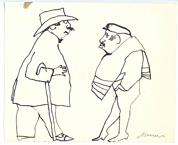 Mino Maccari, Incontro, Disegno Acquarello Anni 2000