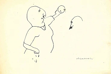 Playing è un disegno a inchiostro di china realizzato da Mino Maccari (1924-1989) nella metà del XX secolo. Firmato a mano. Buone condizioni con lievi fioriture. Mino Maccari (Siena, 1924-Roma, 16 giugno 1989) è stato uno scrittore italiano , pittore, incisore e giornalista, vincitore del Premio Feltrinelli per la Pittura nel 1963 e primo vincitore del Premio Satira Forte dei Marmi nel 1973. Terminati gli studi secondari, si iscrive all'università. Interventista come molti giovani del suo tempo, prese parte alla Grande Guerra all'età di diciannove anni come ufficiale di artiglieria da campo. Al termine del conflitto riprese gli studi universitari a Siena e nel 1920 si laureò in giurisprudenza. Nel 1924 fu chiamato da Angiolo Bencini a curare la stampa della rivista Il Selvaggio, apertamente intransigente fascista, rivoluzionaria e antiborghese, dove furono pubblicate le sue prime incisioni. Dopo alcuni anni di convivenza tra il lavoro al giornale e lo studio legale, all'inizio del 1926 lasciò la professione forense per assumere la direzione de Il Selvaggio che manterrà fino al 1942. Nel 1928 fu autore del piccolo libro edito da Vallecchi (Firenze), Il Trastullo di Strapaese (canzoni e legni incisi) che raccoglieva canti fascisti (lo stesso libro fu più volte sequestrato ad Antonio Gramsci durante la sua detenzione). Con il trasferimento della redazione del Selvaggio nel 1925 da Colle di Val d'Elsa a Firenze, Maccari collaborò con Ardengo Soffici, Ottone Rosai e Achille Lega. Nel frattempo, tra il 1927 e il 1930, si fa conoscere al grande pubblico come pittore partecipando a diverse mostre nazionali. Sempre nel 1930 Maccari lavora a Torino presso La Stampa come caporedattore e ha come direttore lo scrittore Curzio Malaparte. Molto intensa la sua presenza nel mondo culturale ed editoriale del regime fascista, scrive e collabora con diverse riviste: Quadrivio, L'Italia Letteraria, L'Italiano e Omnibus di Leo Longanesi; poi, durante la guerra, ne Il Primato di Bottai e, successivamente ancora, ne Il Mondo di Pannunzio (dal primo numero, nel 1949), fino a Documento di Federigo Valli. Vasta è anche la sua produzione grafica, che spazia dall'Album di Vallecchi (1925), Il trastullo di Strapaese (1928) a Linoleum (1931). Maccari illustrò nel 1934 La vecchia del Bal Bullier di Antonio Baldini e nel 1942 pubblicò la cartella Album, seguita da Come quando fuori Piove e Il superfluo illustrata. Per la sua opera pittorica ricca di evidenti accentuazioni cromatiche e di pennellate veloci, il disegno violento unito alla per il tratto vivace del segno grafico delle sue incisioni, è riconosciuto dalla critica come un artista completo. Nel 1962 gli viene affidata anche la presidenza dell'Accademia di San Luca a Roma e riesce ad ottenere una mostra personale alla Galleria 63 di New York. Infinita è la sua produzione di disegni, acquerelli, tempere, ecc., talvolta in collaborazione con prestigiose case editrici; da citare, a titolo esemplificativo, i 32 disegni in bianco e nero e a colori con cui ha illustrato Il gusto di vivere, volume che raccoglie scritti di Giancarlo Fusco, a cura di Natalia Aspesi e pubblicato da Laterza nel 1985. Maccari, Senese e grande contradaiolo della Torre, dipinse il Palio del 16 agosto 1970 vinto da Selva. Nel 1973 gli viene assegnato il Premio Satira Politica di Forte dei Marmi, premio nato in quell'anno. Morì senza grandi clamori, in silenzio, all'età di novant'anni, a Roma il 16 giugno 1989.