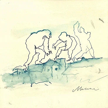 Dance è un disegno a inchiostro e acquerello realizzato da Mino Maccari (1924-1989) nella metà del XX secolo. Firmato a mano. Buone condizioni con lievi fioriture. Mino Maccari (Siena, 1924-Roma, 16 giugno 1989) era un italiano scrittore, pittore, incisore e giornalista, vincitore del Premio Feltrinelli per la Pittura nel 1963 e primo vincitore del Premio Satira Forte dei Marmi nel 1973. Terminati gli studi secondari, si iscrive all'università. Interventista come molti giovani del suo tempo, prese parte alla Grande Guerra all'età di diciannove anni come ufficiale di artiglieria da campo. Al termine del conflitto riprese gli studi universitari a Siena e nel 1920 si laureò in giurisprudenza. Nel 1924 fu chiamato da Angiolo Bencini a curare la stampa della rivista Il Selvaggio, apertamente intransigente fascista, rivoluzionaria e antiborghese, dove furono pubblicate le sue prime incisioni. Dopo alcuni anni di convivenza tra il lavoro al giornale e lo studio legale, all'inizio del 1926 lasciò la professione forense per assumere la direzione de Il Selvaggio che manterrà fino al 1942. Nel 1928 fu autore del piccolo libro edito da Vallecchi (Firenze), Il Trastullo di Strapaese (canzoni e legni incisi) che raccoglieva canti fascisti (lo stesso libro fu più volte sequestrato ad Antonio Gramsci durante la sua detenzione). Con il trasferimento della redazione del Selvaggio nel 1925 da Colle di Val d'Elsa a Firenze, Maccari collaborò con Ardengo Soffici, Ottone Rosai e Achille Lega. Nel frattempo, tra il 1927 e il 1930, si fa conoscere al grande pubblico come pittore partecipando a diverse mostre nazionali. Sempre nel 1930 Maccari lavora a Torino presso La Stampa come caporedattore e ha come direttore lo scrittore Curzio Malaparte. Molto intensa la sua presenza nel mondo culturale ed editoriale del regime fascista, scrive e collabora con diverse riviste: Quadrivio, L'Italia Letteraria, L'Italiano e Omnibus di Leo Longanesi; poi, durante la guerra, ne Il Primato di Bottai e, successivamente ancora, ne Il Mondo di Pannunzio (dal primo numero, nel 1949), fino a Documento di Federigo Valli. Vasta è anche la sua produzione grafica, che spazia dall'Album di Vallecchi (1925), Il trastullo di Strapaese (1928) a Linoleum (1931). Maccari illustrò nel 1934 La vecchia del Bal Bullier di Antonio Baldini e nel 1942 pubblicò la cartella Album, seguita da Come quando fuori Piove e Il superfluo illustrata. Per la sua opera pittorica ricca di evidenti accentuazioni cromatiche e di pennellate veloci, il disegno violento unito alla per il tratto vivace del segno grafico delle sue incisioni, è riconosciuto dalla critica come un artista completo. Nel 1962 gli viene affidata anche la presidenza dell'Accademia di San Luca a Roma e riesce ad ottenere una mostra personale alla Galleria 63 di New York. Infinita è la sua produzione di disegni, acquerelli, tempere, ecc., talvolta in collaborazione con prestigiose case editrici; da citare, a titolo esemplificativo, i 32 disegni in bianco e nero e a colori con cui ha illustrato Il gusto di vivere, volume che raccoglie scritti di Giancarlo Fusco, a cura di Natalia Aspesi e pubblicato da Laterza nel 1985. Maccari, Senese e grande contradaiolo della Torre, dipinse il Palio del 16 agosto 1970 vinto da Selva. Nel 1973 gli viene assegnato il Premio Satira Politica di Forte dei Marmi, premio nato in quell'anno. Morì senza grandi clamori, in silenzio, all'età di novant'anni, a Roma il 16 giugno 1989.