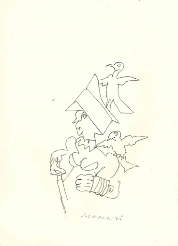 La figura è un'opera d'arte realizzata a inchiostro di china da Mino Maccari (1924-1989) nella metà del XX secolo. Firmato a mano. Buone condizioni con lievi fioriture. Mino Maccari (Siena, 1924-Roma, 16 giugno 1989) era un italiano scrittore, pittore, incisore e giornalista, vincitore del Premio Feltrinelli per la Pittura nel 1963 e primo vincitore del Premio Satira Forte dei Marmi nel 1973. Terminati gli studi secondari, si iscrive all'università. Interventista come molti giovani del suo tempo, prese parte alla Grande Guerra all'età di diciannove anni come ufficiale di artiglieria da campo. Al termine del conflitto riprese gli studi universitari a Siena e nel 1920 si laureò in giurisprudenza. Nel 1924 fu chiamato da Angiolo Bencini a curare la stampa della rivista Il Selvaggio, apertamente intransigente fascista, rivoluzionaria e antiborghese, dove furono pubblicate le sue prime incisioni. Dopo alcuni anni di convivenza tra il lavoro al giornale e lo studio legale, all'inizio del 1926 lasciò la professione forense per assumere la direzione de Il Selvaggio che manterrà fino al 1942. Nel 1928 fu autore del piccolo libro edito da Vallecchi (Firenze), Il Trastullo di Strapaese (canzoni e legni incisi) che raccoglieva canti fascisti (lo stesso libro fu più volte sequestrato ad Antonio Gramsci durante la sua detenzione). Con il trasferimento della redazione del Selvaggio nel 1925 da Colle di Val d'Elsa a Firenze, Maccari collaborò con Ardengo Soffici, Ottone Rosai e Achille Lega. Nel frattempo, tra il 1927 e il 1930, si fa conoscere al grande pubblico come pittore partecipando a diverse mostre nazionali. Sempre nel 1930 Maccari lavora a Torino presso La Stampa come caporedattore e ha come direttore lo scrittore Curzio Malaparte. Molto intensa la sua presenza nel mondo culturale ed editoriale del regime fascista, scrive e collabora con diverse riviste: Quadrivio, L'Italia Letteraria, L'Italiano e Omnibus di Leo Longanesi; poi, durante la guerra, ne Il Primato di Bottai e, successivamente ancora, ne Il Mondo di Pannunzio (dal primo numero, nel 1949), fino a Documento di Federigo Valli. Vasta è anche la sua produzione grafica, che spazia dall'Album di Vallecchi (1925), Il trastullo di Strapaese (1928) a Linoleum (1931). Maccari illustrò nel 1934 La vecchia del Bal Bullier di Antonio Baldini e nel 1942 pubblicò la cartella Album, seguita da Come quando fuori Piove e Il superfluo illustrata. Per la sua opera pittorica ricca di evidenti accentuazioni cromatiche e di pennellate veloci, il disegno violento unito alla per il tratto vivace del segno grafico delle sue incisioni, è riconosciuto dalla critica come un artista completo. Nel 1962 gli viene affidata anche la presidenza dell'Accademia di San Luca a Roma e riesce ad ottenere una mostra personale alla Galleria 63 di New York. Infinita è la sua produzione di disegni, acquerelli, tempere, ecc., talvolta in collaborazione con prestigiose case editrici; da citare, a titolo esemplificativo, i 32 disegni in bianco e nero e a colori con cui ha illustrato Il gusto di vivere, volume che raccoglie scritti di Giancarlo Fusco, a cura di Natalia Aspesi e pubblicato da Laterza nel 1985. Maccari, Senese e grande contradaiolo della Torre, dipinse il Palio del 16 agosto 1970 vinto da Selva. Nel 1973 gli viene assegnato il Premio Satira Politica di Forte dei Marmi, premio nato in quell'anno. Morì senza grandi clamori, in silenzio, all'età di novant'anni, a Roma il 16 giugno 1989.