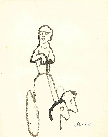 Rider è un disegno ad acquerello realizzato da Mino Maccari (1924-1989) nella metà del XX secolo. Firmato a mano. Buone condizioni con lievi fioriture. Mino Maccari (Siena, 1924-Roma, 16 giugno 1989) è stato uno scrittore, pittore italiano , incisore e giornalista, vincitore del Premio Feltrinelli per la Pittura nel 1963 e primo vincitore del Premio Satira Forte dei Marmi nel 1973. Terminati gli studi secondari, si iscrive all'università. Interventista come molti giovani del suo tempo, prese parte alla Grande Guerra all'età di diciannove anni come ufficiale di artiglieria da campo. Al termine del conflitto riprese gli studi universitari a Siena e nel 1920 si laureò in giurisprudenza. Nel 1924 fu chiamato da Angiolo Bencini a curare la stampa della rivista Il Selvaggio, apertamente intransigente fascista, rivoluzionaria e antiborghese, dove furono pubblicate le sue prime incisioni. Dopo alcuni anni di convivenza tra il lavoro al giornale e lo studio legale, all'inizio del 1926 lasciò la professione forense per assumere la direzione de Il Selvaggio che manterrà fino al 1942. Nel 1928 fu autore del piccolo libro edito da Vallecchi (Firenze), Il Trastullo di Strapaese (canzoni e legni incisi) che raccoglieva canti fascisti (lo stesso libro fu più volte sequestrato ad Antonio Gramsci durante la sua detenzione). Con il trasferimento della redazione del Selvaggio nel 1925 da Colle di Val d'Elsa a Firenze, Maccari collaborò con Ardengo Soffici, Ottone Rosai e Achille Lega. Nel frattempo, tra il 1927 e il 1930, si fa conoscere al grande pubblico come pittore partecipando a diverse mostre nazionali. Sempre nel 1930 Maccari lavora a Torino presso La Stampa come caporedattore e ha come direttore lo scrittore Curzio Malaparte. Molto intensa la sua presenza nel mondo culturale ed editoriale del regime fascista, scrive e collabora con diverse riviste: Quadrivio, L'Italia Letteraria, L'Italiano e Omnibus di Leo Longanesi; poi, durante la guerra, ne Il Primato di Bottai e, successivamente ancora, ne Il Mondo di Pannunzio (dal primo numero, nel 1949), fino a Documento di Federigo Valli. Vasta è anche la sua produzione grafica, che spazia dall'Album di Vallecchi (1925), Il trastullo di Strapaese (1928) a Linoleum (1931). Maccari illustrò nel 1934 La vecchia del Bal Bullier di Antonio Baldini e nel 1942 pubblicò la cartella Album, seguita da Come quando fuori Piove e Il superfluo illustrata. Per la sua opera pittorica ricca di evidenti accentuazioni cromatiche e di pennellate veloci, il disegno violento unito alla per il tratto vivace del segno grafico delle sue incisioni, è riconosciuto dalla critica come un artista completo. Nel 1962 gli viene affidata anche la presidenza dell'Accademia di San Luca a Roma e riesce ad ottenere una mostra personale alla Galleria 63 di New York. Infinita è la sua produzione di disegni, acquerelli, tempere, ecc., talvolta in collaborazione con prestigiose case editrici; da citare, a titolo esemplificativo, i 32 disegni in bianco e nero e a colori con cui ha illustrato Il gusto di vivere, volume che raccoglie scritti di Giancarlo Fusco, a cura di Natalia Aspesi e pubblicato da Laterza nel 1985. Maccari, Senese e grande contradaiolo della Torre, dipinse il Palio del 16 agosto 1970 vinto da Selva. Nel 1973 gli viene assegnato il Premio Satira Politica di Forte dei Marmi, premio nato in quell'anno. Morì senza grandi clamori, in silenzio, all'età di novant'anni, a Roma il 16 giugno 1989.
