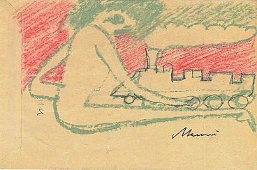 Train è un disegno a pastello realizzato da Mino Maccari (1924-1989) nella metà del XX secolo. Firmato a mano. Buone condizioni con lievi fioriture. Mino Maccari (Siena, 1924-Roma, 16 giugno 1989) è stato uno scrittore italiano, pittore, incisore e giornalista, vincitore del Premio Feltrinelli per la Pittura nel 1963 e primo vincitore del Premio Satira Forte dei Marmi nel 1973. Terminati gli studi secondari, si iscrive all'università. Interventista come molti giovani del suo tempo, prese parte alla Grande Guerra all'età di diciannove anni come ufficiale di artiglieria da campo. Al termine del conflitto riprese gli studi universitari a Siena e nel 1920 si laureò in giurisprudenza. Nel 1924 fu chiamato da Angiolo Bencini a curare la stampa della rivista Il Selvaggio, apertamente intransigente fascista, rivoluzionaria e antiborghese, dove furono pubblicate le sue prime incisioni. Dopo alcuni anni di convivenza tra il lavoro al giornale e lo studio legale, all'inizio del 1926 lasciò la professione forense per assumere la direzione de Il Selvaggio che manterrà fino al 1942. Nel 1928 fu autore del piccolo libro edito da Vallecchi (Firenze), Il Trastullo di Strapaese (canzoni e legni incisi) che raccoglieva canti fascisti (lo stesso libro fu più volte sequestrato ad Antonio Gramsci durante la sua detenzione). Con il trasferimento della redazione del Selvaggio nel 1925 da Colle di Val d'Elsa a Firenze, Maccari collaborò con Ardengo Soffici, Ottone Rosai e Achille Lega. Nel frattempo, tra il 1927 e il 1930, si fa conoscere al grande pubblico come pittore partecipando a diverse mostre nazionali. Sempre nel 1930 Maccari lavora a Torino presso La Stampa come caporedattore e ha come direttore lo scrittore Curzio Malaparte. Molto intensa la sua presenza nel mondo culturale ed editoriale del regime fascista, scrive e collabora con diverse riviste: Quadrivio, L'Italia Letteraria, L'Italiano e Omnibus di Leo Longanesi; poi, durante la guerra, ne Il Primato di Bottai e, successivamente ancora, ne Il Mondo di Pannunzio (dal primo numero, nel 1949), fino a Documento di Federigo Valli. Vasta è anche la sua produzione grafica, che spazia dall'Album di Vallecchi (1925), Il trastullo di Strapaese (1928) a Linoleum (1931). Maccari illustrò nel 1934 La vecchia del Bal Bullier di Antonio Baldini e nel 1942 pubblicò la cartella Album, seguita da Come quando fuori Piove e Il superfluo illustrata. Per la sua opera pittorica ricca di evidenti accentuazioni cromatiche e di pennellate veloci, il disegno violento unito alla per il tratto vivace del segno grafico delle sue incisioni, è riconosciuto dalla critica come un artista completo. Nel 1962 gli viene affidata anche la presidenza dell'Accademia di San Luca a Roma e riesce ad ottenere una mostra personale alla Galleria 63 di New York. Infinita è la sua produzione di disegni, acquerelli, tempere, ecc., talvolta in collaborazione con prestigiose case editrici; da citare, a titolo esemplificativo, i 32 disegni in bianco e nero e a colori con cui ha illustrato Il gusto di vivere, volume che raccoglie scritti di Giancarlo Fusco, a cura di Natalia Aspesi e pubblicato da Laterza nel 1985. Maccari, Senese e grande contradaiolo della Torre, dipinse il Palio del 16 agosto 1970 vinto da Selva. Nel 1973 gli viene assegnato il Premio Satira Politica di Forte dei Marmi, premio nato in quell'anno. Morì senza grandi clamori, in silenzio, all'età di novant'anni, a Roma il 16 giugno 1989.