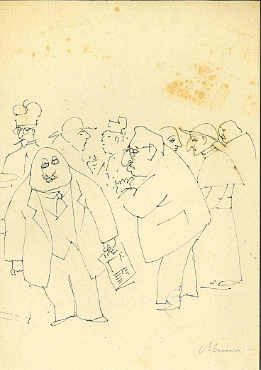 Gathering è un disegno a inchiostro di china realizzato da Mino Maccari (1924-1989) nella metà del XX secolo. Firmato a mano. Buone condizioni con lievi fioriture. Mino Maccari (Siena, 1924-Roma, 16 giugno 1989) è stato uno scrittore italiano , pittore, incisore e giornalista, vincitore del Premio Feltrinelli per la Pittura nel 1963 e primo vincitore del Premio Satira Forte dei Marmi nel 1973. Terminati gli studi secondari, si iscrive all'università. Interventista come molti giovani del suo tempo, prese parte alla Grande Guerra all'età di diciannove anni come ufficiale di artiglieria da campo. Al termine del conflitto riprese gli studi universitari a Siena e nel 1920 si laureò in giurisprudenza. Nel 1924 fu chiamato da Angiolo Bencini a curare la stampa della rivista Il Selvaggio, apertamente intransigente fascista, rivoluzionaria e antiborghese, dove furono pubblicate le sue prime incisioni. Dopo alcuni anni di convivenza tra il lavoro al giornale e lo studio legale, all'inizio del 1926 lasciò la professione forense per assumere la direzione de Il Selvaggio che manterrà fino al 1942. Nel 1928 fu autore del piccolo libro edito da Vallecchi (Firenze), Il Trastullo di Strapaese (canzoni e legni incisi) che raccoglieva canti fascisti (lo stesso libro fu più volte sequestrato ad Antonio Gramsci durante la sua detenzione). Con il trasferimento della redazione del Selvaggio nel 1925 da Colle di Val d'Elsa a Firenze, Maccari collaborò con Ardengo Soffici, Ottone Rosai e Achille Lega. Nel frattempo, tra il 1927 e il 1930, si fa conoscere al grande pubblico come pittore partecipando a diverse mostre nazionali. Sempre nel 1930 Maccari lavora a Torino presso La Stampa come caporedattore e ha come direttore lo scrittore Curzio Malaparte. Molto intensa la sua presenza nel mondo culturale ed editoriale del regime fascista, scrive e collabora con diverse riviste: Quadrivio, L'Italia Letteraria, L'Italiano e Omnibus di Leo Longanesi; poi, durante la guerra, ne Il Primato di Bottai e, successivamente ancora, ne Il Mondo di Pannunzio (dal primo numero, nel 1949), fino a Documento di Federigo Valli. Vasta è anche la sua produzione grafica, che spazia dall'Album di Vallecchi (1925), Il trastullo di Strapaese (1928) a Linoleum (1931). Maccari illustrò nel 1934 La vecchia del Bal Bullier di Antonio Baldini e nel 1942 pubblicò la cartella Album, seguita da Come quando fuori Piove e Il superfluo illustrata. Per la sua opera pittorica ricca di evidenti accentuazioni cromatiche e di pennellate veloci, il disegno violento unito alla per il tratto vivace del segno grafico delle sue incisioni, è riconosciuto dalla critica come un artista completo. Nel 1962 gli viene affidata anche la presidenza dell'Accademia di San Luca a Roma e riesce ad ottenere una mostra personale alla Galleria 63 di New York. Infinita è la sua produzione di disegni, acquerelli, tempere, ecc., talvolta in collaborazione con prestigiose case editrici; da citare, a titolo esemplificativo, i 32 disegni in bianco e nero e a colori con cui ha illustrato Il gusto di vivere, volume che raccoglie scritti di Giancarlo Fusco, curato da Natalia Aspesi e pubblicato da Laterza nel 1985. Maccari, Senese e grande contradaiolo della Torre, dipinse il Palio del 16 agosto 1970 vinto da Selva. Nel 1973 gli viene assegnato il Premio Satira Politica di Forte dei Marmi, premio nato in quell'anno. Morì senza grandi clamori, in silenzio, all'età di novant'anni, a Roma il 16 giugno 1989.