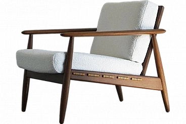 La struttura minimalista in teak e l'ampia seduta e lo schienale imbottiti creano una poltrona comoda e di grande effetto. La struttura e le gambe sono in legno massiccio. I dettagli raffinati non solo aggiungono originalità e carattere unico al mobile, ma testimoniano anche la straordinaria abilità artigianale e la precisione della lavorazione. La poltrona è stata rinnovata con una finitura a olio naturale, che protegge il legno e gli conferisce un aspetto naturale e caldo. I cuscini sono stati rinnovati con tessuto bouclé di colore bianco. Seduta con cinghie. larghezza seduta 55 CM profondità 50 CM