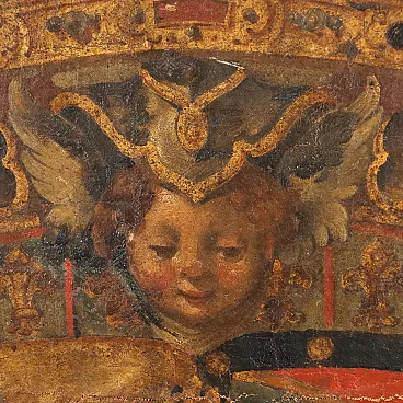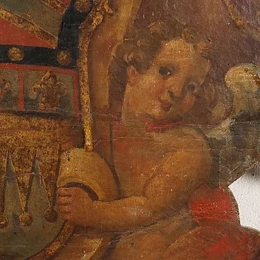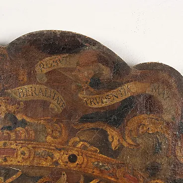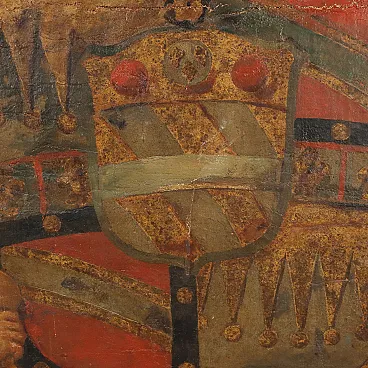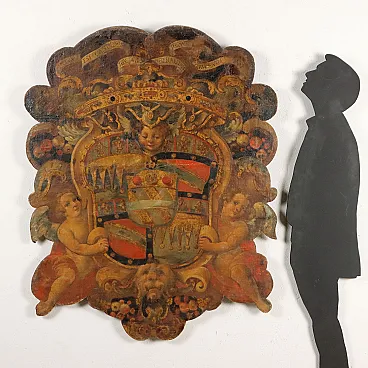 Grande stemma nobiliare posto entro accartocciato che si sviluppa in modo simmetrico, realizzato in legno dipinto in policromia e parzialmente dorato. La cornice è ornata da volute e festoni di frutta, mentre nella parte superiore si dipana un nastro riportante il motto in latino “INTVS EST CANDIDUS RECTA LIBERALITATE ROBV(R) PRUDENTIAE” (“Una retta liberalità è più chiara di forza o prudenza”). Lo scudo, sostenuto da una coppia di putti e ornato nella parte inferiore da un mascherone grottesco, è sormontato da una corona e tre gorgiere, nella parte superiore al centro presenta testa di cherubino; è inquartato, nel primo e nel terzo di azzurro cuneato di oro, capo d'Angiò, nel secondo e nel terzo di rosso bordato di nero con palle di oro, banda azzurra bordata di oro, capo d'Angiò. Al centro presente un altro stemma bandato di azzurro e oro con fascia azzurra, capo dei Medici.