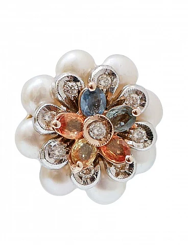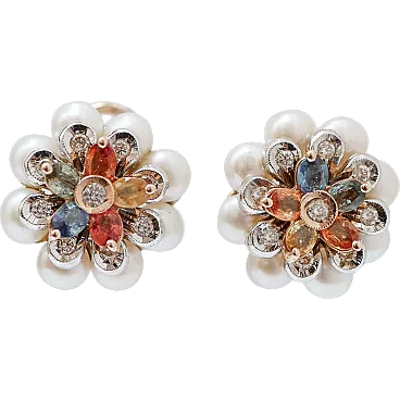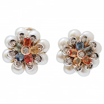 Orecchini a fiore in oro con zaffiri, diamanti e perle, anni '80
