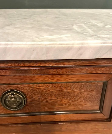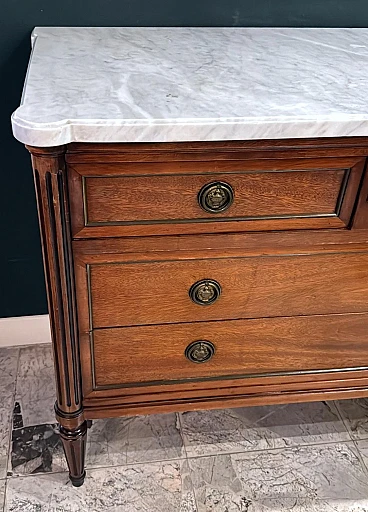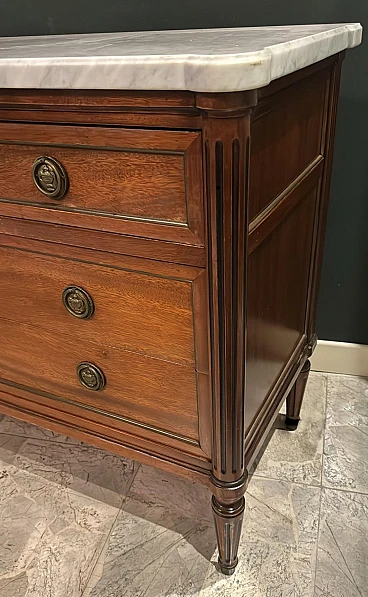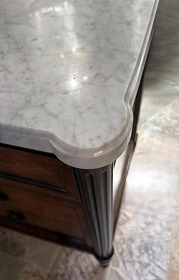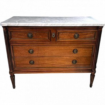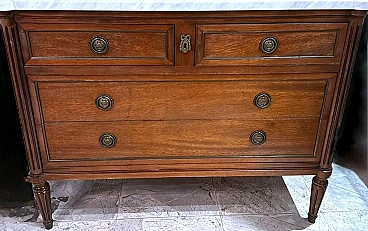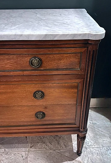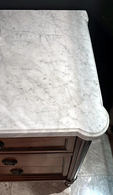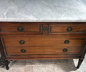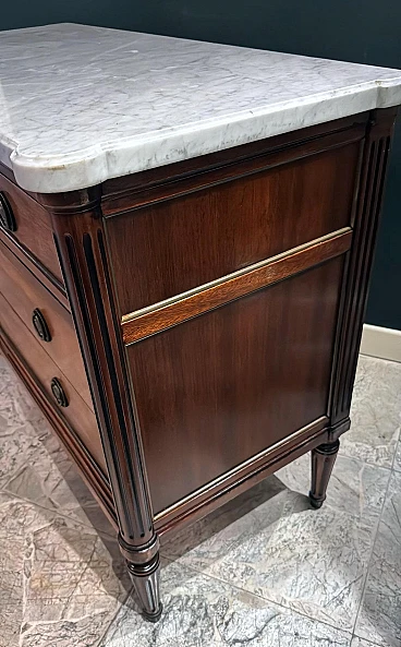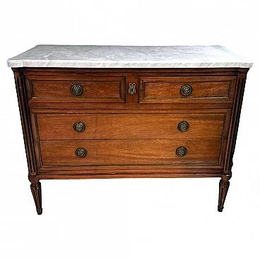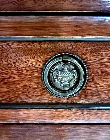 Questa elegante e sobria cassettiera francese in legno è realizzata interamente in Oak Oak di altissima qualità. Questo tipo di legno, noto per la ricchezza dei colori, la stabilità dimensionale, la resistenza agli urti e la durevolezza, è molto apprezzato nei mobili di fascia alta. Le venature naturali del rovere, sempre uniche, conferiscono al comò un aspetto elegante, raffinato e distintivo. La cassettiera presenta due cassetti sotto il piano e due cassetti più grandi nella parte inferiore. Tra i due cassetti superiori c'è una finta serratura, aggiunta solo a scopo decorativo. I manici a sei anelli, realizzati in bronzo fuso, raffigurano un'anfora greca con manici antropomorfi. I frontali dei cassetti e i lati della cassapanca sono impreziositi da eleganti finiture in bronzo. Le quattro gambe affusolate e scanalate verso il basso si estendono verso l'alto con decorazioni che migliorano ulteriormente l'estetica del mobile. Il piano rettangolare è squisitamente sagomato, soprattutto negli angoli anteriori. È realizzato in marmo "Bianco Gioia Venato" di Carrara, un materiale estratto nelle Alpi Apuane e universalmente riconosciuto come uno dei marmi più pregiati al mondo. Questa varietà di marmo, con una tonalità così elegante da sembrare quasi eterea, è stata scelta da alcuni dei più grandi scultori e artisti della storia, tra cui Michelangelo, Donatello, Bernini e Canova, per le loro opere più famose. Il comò è stato realizzato tra il 1910 e il 1915 in stile Luigi XVI presso un laboratorio di Lione, una città che è stata un importante centro di produzione di mobili fin dal XVII secolo. Lione era rinomata per i suoi mobili in stile rinascimentale e rococò, prodotti da numerose fabbriche e artigiani che creavano pezzi di alta qualità su commissione per le ricche famiglie locali. Lo stile Luigi XVI, nato in Francia negli ultimi decenni del XVIII secolo, si diffuse rapidamente in tutta Europa, conquistando il favore del pubblico per le sue linee classiche ed eleganti, in contrasto con l'asimmetria e l'abbondanza di elementi decorativi tipici degli stili Rococò e Luigi XV che avevano dominato l'epoca precedente. Un elemento chiave dello stile Luigi XVI è il rinnovato interesse per i temi della cultura classica greca e romana, che porta a forme lineari, compostezza geometrica, decorazione simmetrica e riferimenti all'antichità. Ghirlande, foglie di alloro, fregi, motivi floreali, intarsi mitologici, colonne e capitelli furono combinati con materiali lussuosi come legni pregiati, bronzo dorato e marmo, in una sintesi formale che rifletteva i nuovi gusti dell'epoca, che divenne nota come Luigi XVI. Ancora oggi, i mobili in questo stile sono sinonimo di eleganza e prestigio. La cassettiera è in buone condizioni. Dimensioni: larghezza 109 cm, profondità 50 cm, altezza 85 cm.