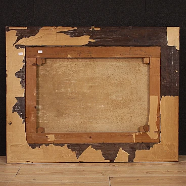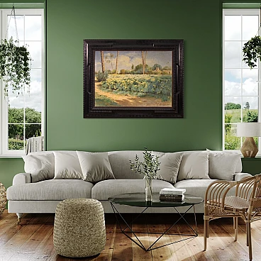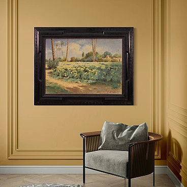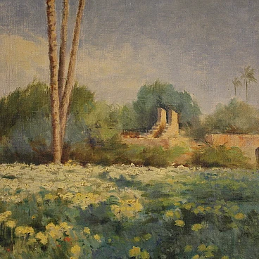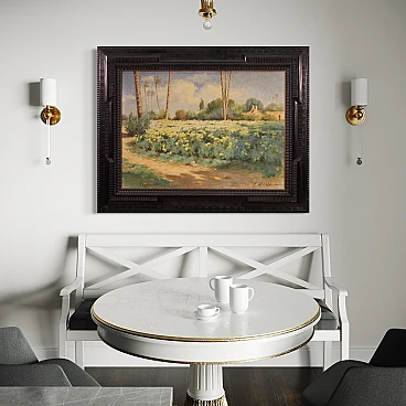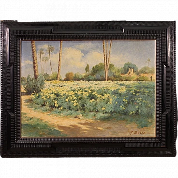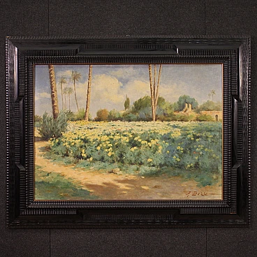 Dipinto italiano della prima metà del XX secolo. Opera olio su tela raffigurante luminosa veduta dal titolo Crisantemi nell’oasi di Tripoli firmata in basso a destra A. Bezzi (vedi foto). Dipinto riferibile al pittore italiano Armando Bezzi, mancante di autentica. Sul telaio, nel retro del dipinto è presente una dedica del pittore Solo per voi, o eroi, crescon nell’oasi i fiori a mille a mille. Quadro di grande misura e impatto adornato da cornice lignea guilluche di bella decorazione. Opera in prima tela, in bellissima patina e in buono stato conservativo, per antiquari e collezionisti. Luce dipinto H 77 x L 107 cm.
