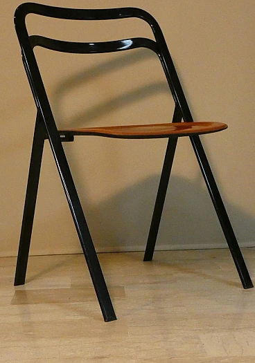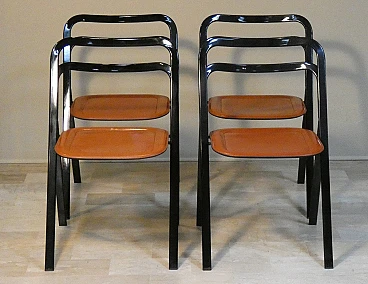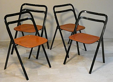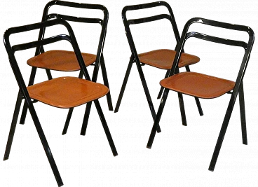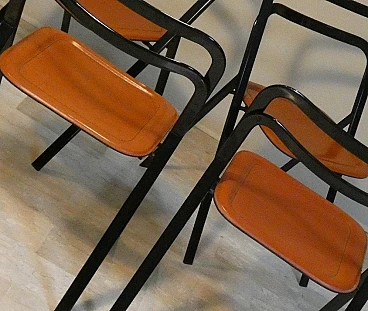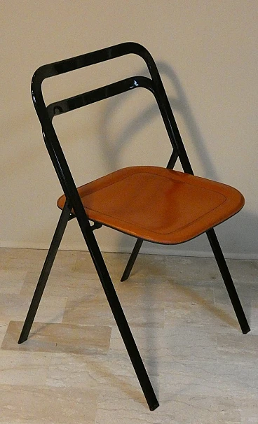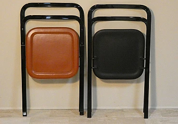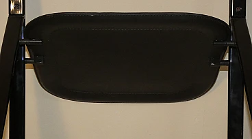 Set di 6 sedie da pranzo pieghevoli vintage prodotte da CIDUE e con design di Giorgio Cattelan nei primissimi anni '80. Sono realizzate con struttura in acciaio laccato in colore nero e sedute in cuoio. Questo fantastico set disegnato da Giorgio Cattelan e prodotto da Cidue in Italia negli anni Settanta è un perfetto esempio di design di metà secolo... molto eleganti nelle loro linee semplici e funzionali grazie alla loro solida struttura. Questo set è perfetto per il soggiorno, lo studio o la sala da pranzo. Piegate si ripongono facilmente poichè si riducono ad uno spazio di appena 10 cm. ogni sedia.