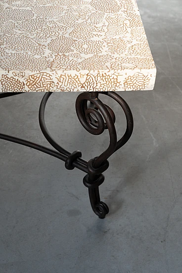 Aggiungi un tocco unico e organico al tuo spazio abitativo con questo sorprendente tavolino Elite degli anni '90, caratterizzato da un termitaio e piano in resina e una base in ferro battuto splendidamente realizzata. Questo pezzo fonde la bellezza cruda della natura con la raffinata lavorazione artigianale, dando vita a un mobile eccezionale e intrigante.