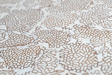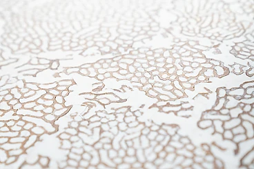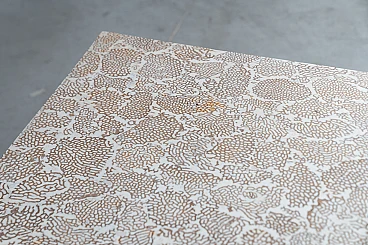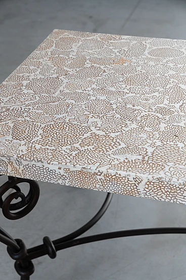 Materiale: il piano del tavolo è realizzato con veri nidi di termiti, che sono stati tagliati, levigati e disposti meticolosamente. I nidi sono incastonati nella resina e modellati in una superficie liscia, creando una trama e un motivo affascinanti. La base è realizzata in robusto ferro battuto, elegantemente progettata per completare l'estetica organica del piano del tavolo.