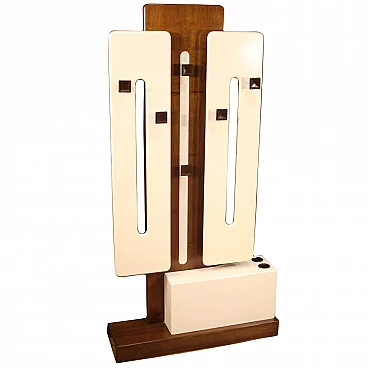 Attaccapanni di design italiano degli anni 60 / 70. Mobile di produzione Luigi Sormani in legno di noce con elementi laccati e in plastica (vedi foto) di bella decorazione. Appendiabiti con ante richiudibili (vedi foto) e due porta ombrelli nella base (di cui uno con una piccola mancanza vedi foto). Mobile ideale per un ingresso o corridoio, per arredatori e amatori del mobile di design italiano. Attaccapanni di piacevole arredamento, nel complesso in discreto stato conservativo.