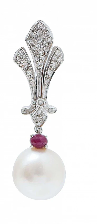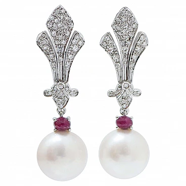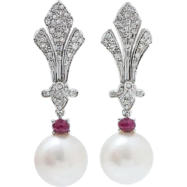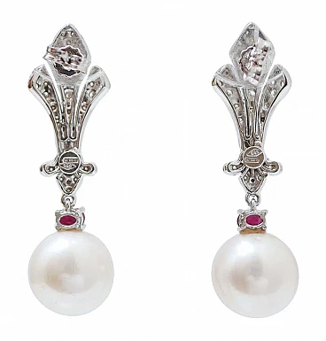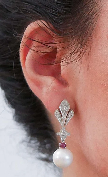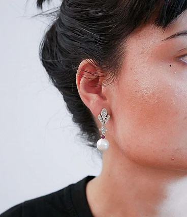 Orecchini in oro con perle bianche, rubini, e diamanti, anni '70
