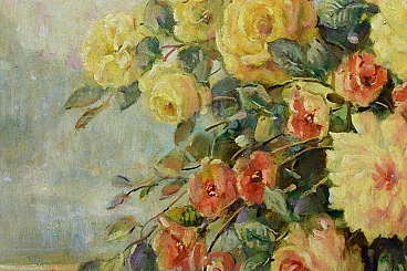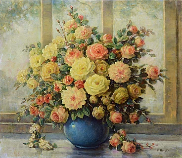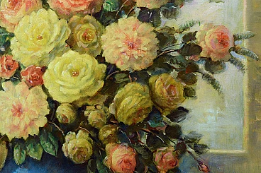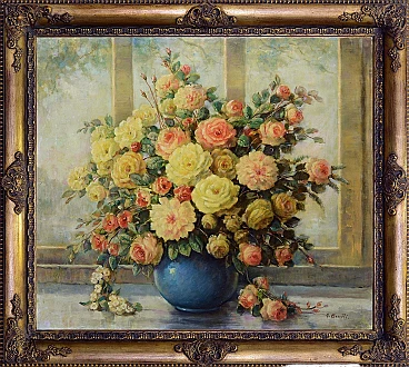 Immergetevi nell'eleganza senza tempo di "Composizione floreale in vaso blu" di Giovanni Bonetti, un affascinante dipinto a olio degli anni Ottanta. Questa squisita opera d'arte ritrae magnificamente un lussureggiante bouquet di fiori nelle vibranti tonalità del giallo e del rosa, su uno sfondo sereno. L'abile uso del colore e della luce da parte di Bonetti aggiunge profondità e dimensione, dando vita a questa composizione floreale. Incorniciato in una cornice di legno laccato con intricati dettagli in foglia d'oro, questo dipinto emana raffinatezza e fascino. La delicata pennellata e l'attenzione ai dettagli evidenziano la maestria di Bonetti nel catturare la bellezza naturale di ogni fiore, rendendo questo pezzo un punto focale perfetto per qualsiasi interno elegante. Il dipinto misura 70x80 cm, mentre le dimensioni complessive con la cornice sono di 86x96 cm, rendendolo un'aggiunta ideale a una collezione d'arte o a un arredamento raffinato. Lo stile caratteristico di Bonetti, che combina il realismo con un tocco poetico, è evidente in questo capolavoro, che diventa un must per gli amanti dell'arte e delle composizioni floreali.
