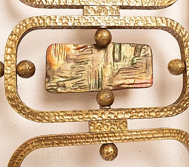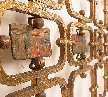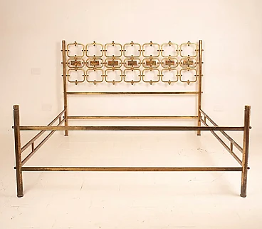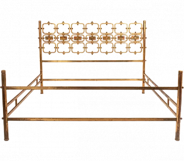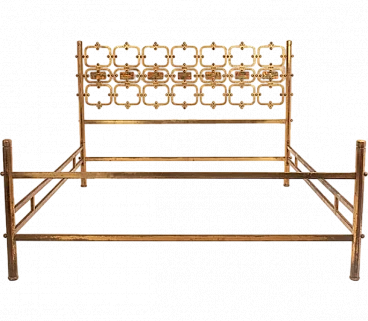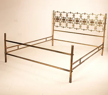 Il letto è interamente realizzato in fusioni di ottone martellato e piastre in bronzo, con elementi decorativi orizzontali in smaltature metalliche con concavi e convessi astratti dei primi anni di lavoro del grande Maestro. Attualmente unico in commercio in questa versione a 3 file di anelli, due grandi sopra e sotto ed uno piu piccolo centrale con piastre dell'artista all'interno, probabilmente una delle prime prodotte e con una storia molto importante. Il letto si presenta in ottime condizioni originali con patina originale dell'epoca, è stato solo pulito ma non lucidato per non variare la storia dei suoi quasi 80 anni.