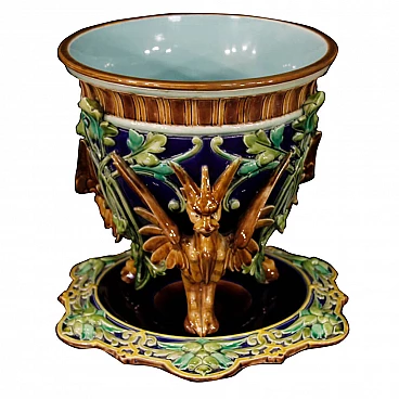 Grande vaso francese del XX secolo. Oggetto in ceramica smaltata e dipinta con linee e figure in stile Art Nouveau. Vaso e basamento che presentano timbri (vedi foto) “Majolica Sarreguemines 426”, per antiquari e collezionisti. In buone condizioni e senza rotture, presenta qualche piccolo segno di usura.
