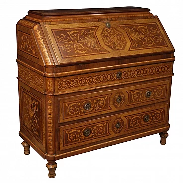 Elegante ribalta italiana del XX secolo in stile Luigi XVI. Mobile di gran carattere e qualità nello stile Maggiolini, riccamente intarsiato in legni di noce, bois de rose, palissandro, acero, legno ebanizzato, mogano e legni da frutto. Ribalta di ottima proporzione, ideale da inserire in un salone o studio, per arredatori, antiquari e amatori del mobile italiano. Mobile a tre cassetti esterni di buona capacità, calatoia che offre internamente 6 cassettini, tre vani centrali porta documenti e piano scrittoio intarsiato (vedi foto). Mobile che nasconde due segreti laterali posti nel retro dei cassettini e visibili aprendo il piano superiore della ribalta (vedi foto). Ribalta sostenuta da gambe anch'esse finemente intarsiate (vedi foto). Mobile di eccezionale qualità e impatto, con qualche piccolo segno del tempo. Mancante di chiavi, nel complesso in buono stato conservativo.