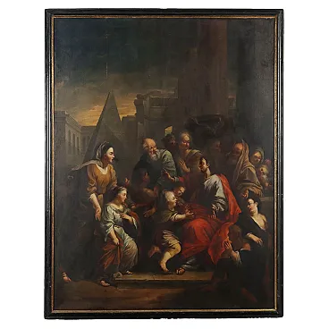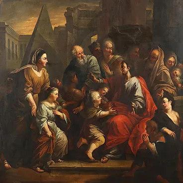 La scena è piena di figure che si sovrappongono e intrecciano: in primo piano Gesù seduto sulla destra, apre le braccia in segno di accoglienza dei bambini che gli si avvicinano, spinti dalle madri; in secondo piano i discepoli, con Pietro riconoscibile al centro che cerca di allontanare un ragazzino, ma il loro sguardo è rivolto al Cristo, che li guarda e li esorta all'accoglienza.