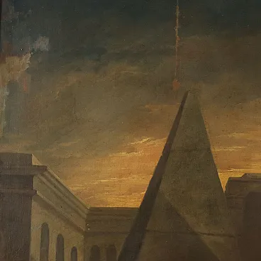 Di sfondo alla scena compaiono alcune architetture, in particolare spicca la piramide che simbolicamente rappresenta la tensione, l'ascesa verso l'alto.