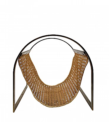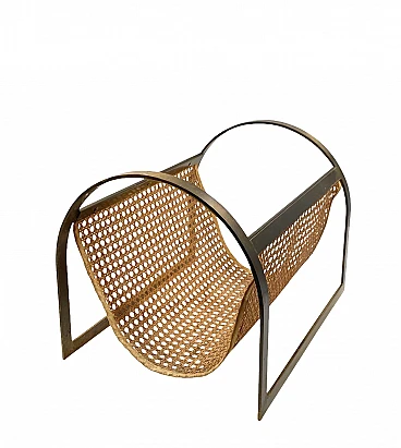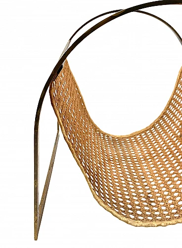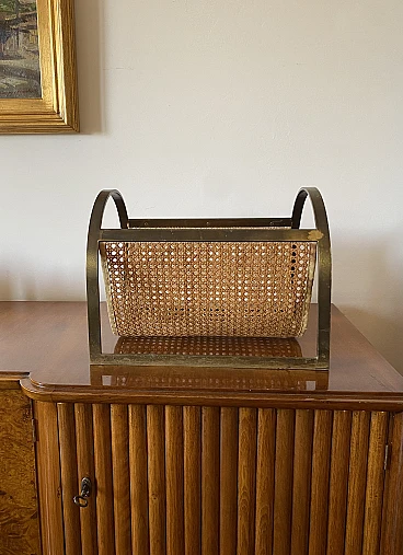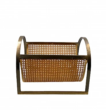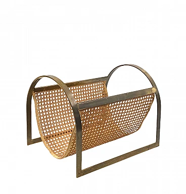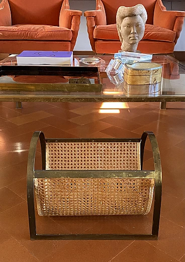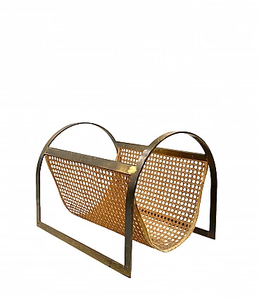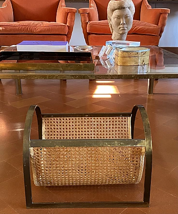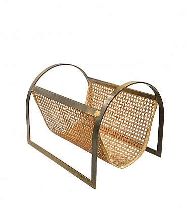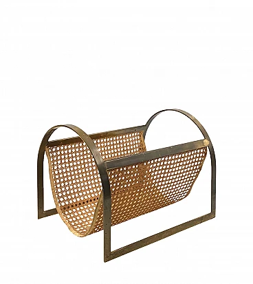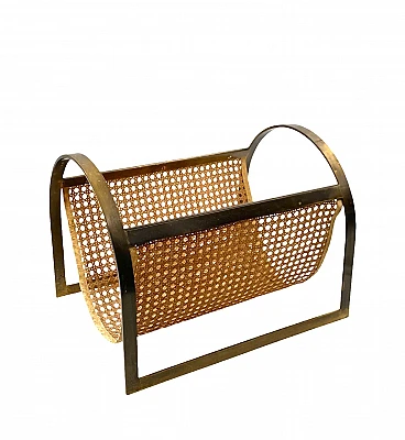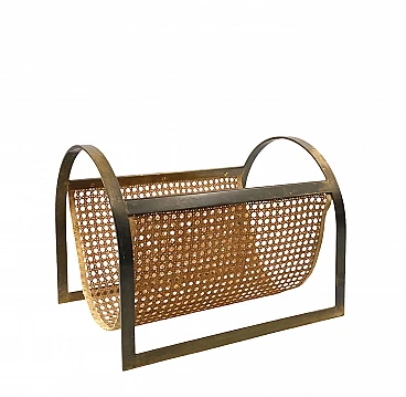 Hollywood regency brass and Vienna straw magazine rack, Italy 1970